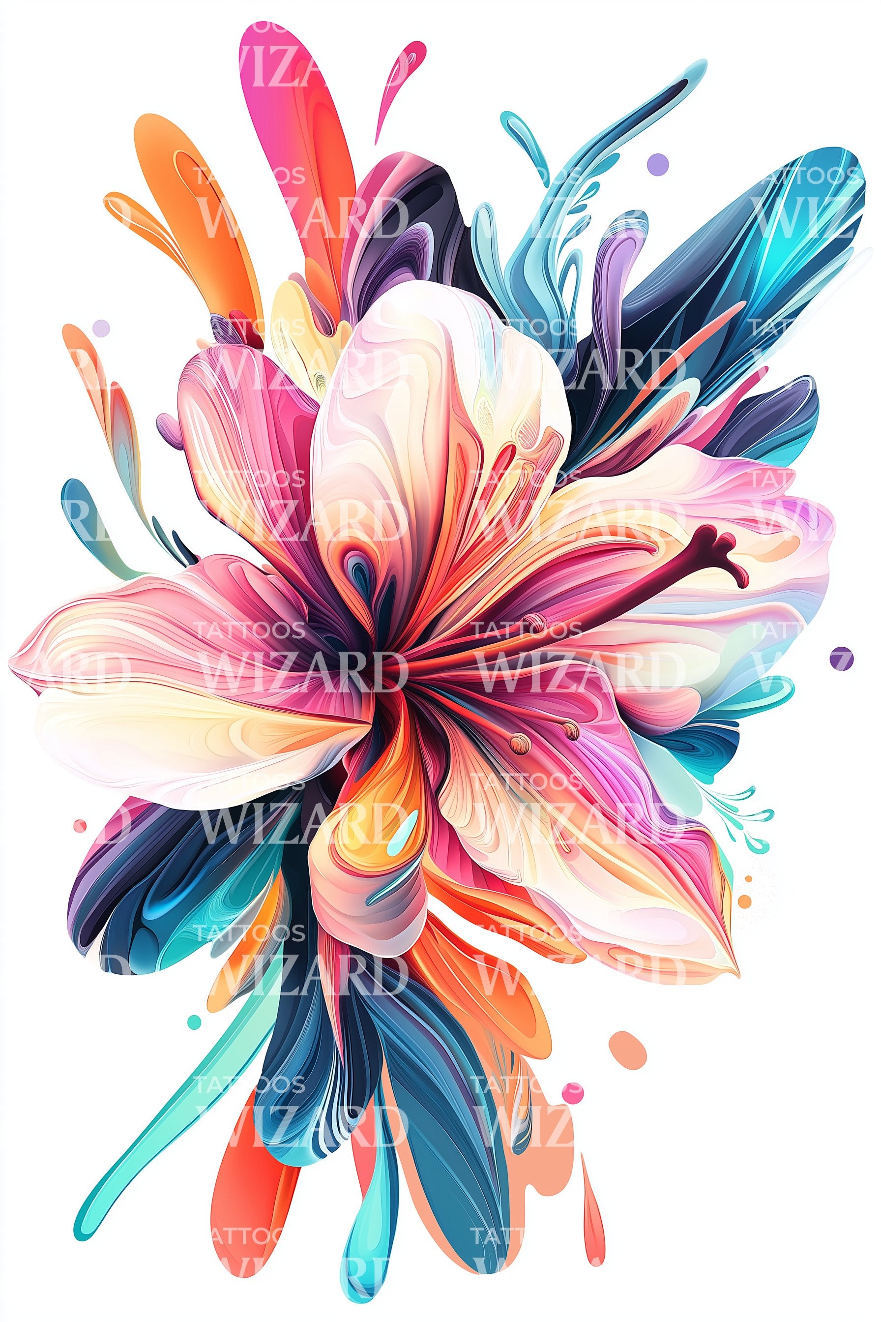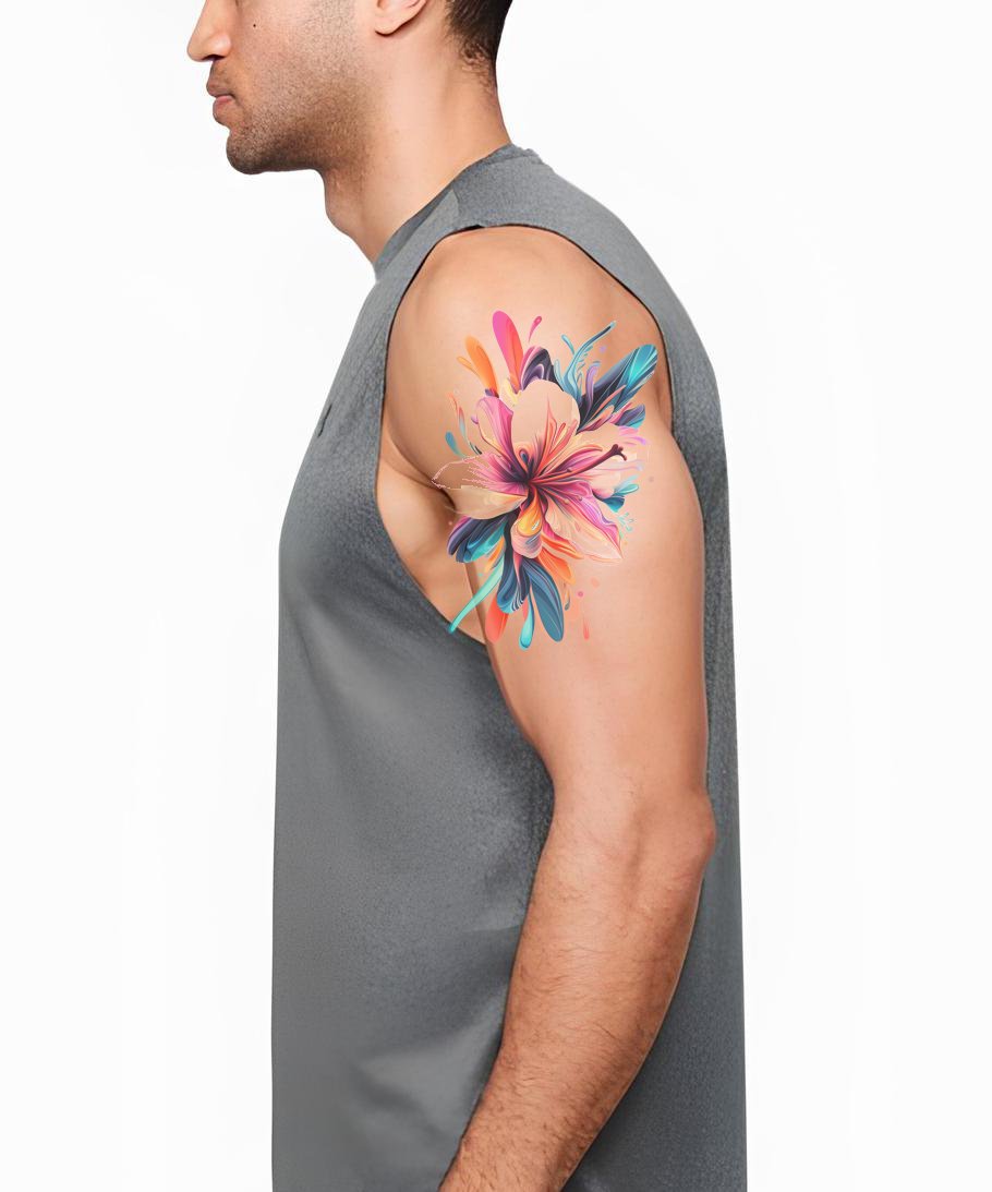 Погрузитесь в очарование этого яркого, абстрактного акварельного тату-дизайна. Этот шедевр воплощает в себе прелесть цветов, разбросанных множеством потрясающих оттенков. Это не просто татуировка, это произведение носимого искусства, добавляющее постоянный всплеск цвета на ваше полотно.