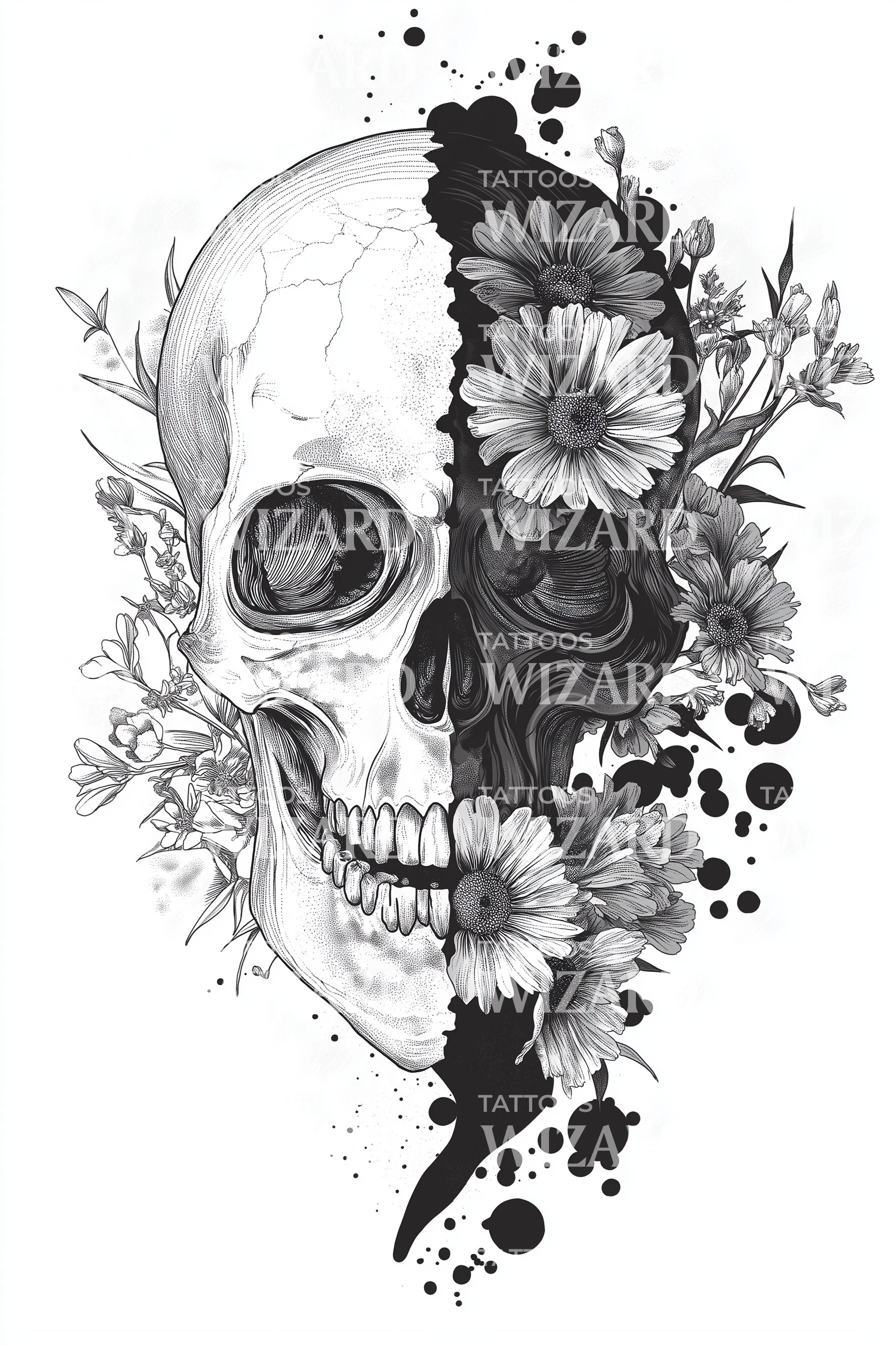 Этот поразительный дизайн татуировки представляет собой притягательный контраст между жизнью и смертью. Одна половина дизайна изображает зловещий череп, символизирующий смертность, в то время как другая половина расцветает яркими цветами, олицетворяющими жизнь. Эта разделённая иллюстрация прекрасно воплощает дихотомию бытия.