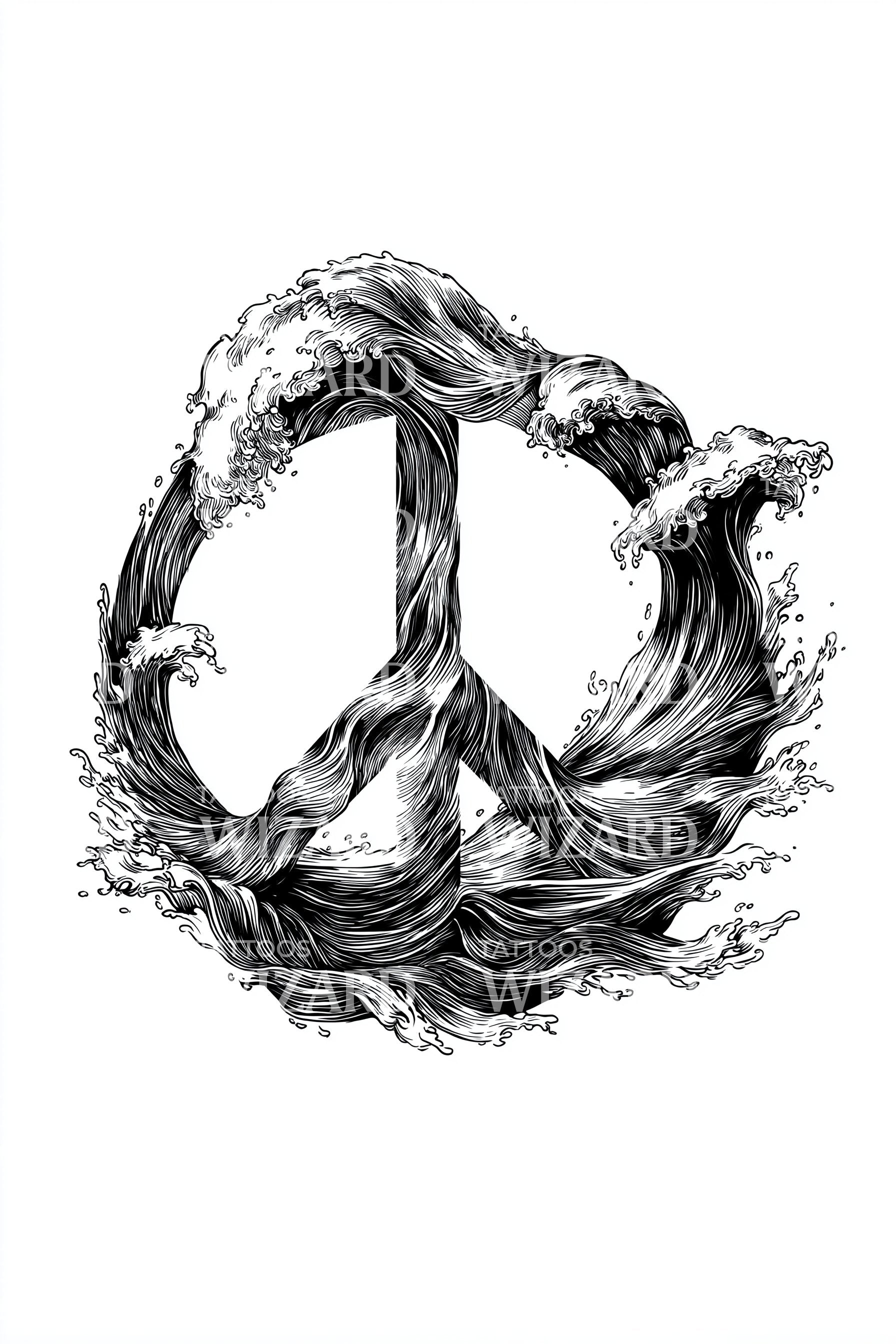 Blackwork waves carve a ringed peace sigil, all froth, riptide lines, and storm-slick texture. Water becomes shelter, circling chaos to hold stillness at the center. Symbol of calm endurance and reconciled force, this piece lets its wearer feel anchored, brave, and quietly unbreakable. A tide for choosing peace.