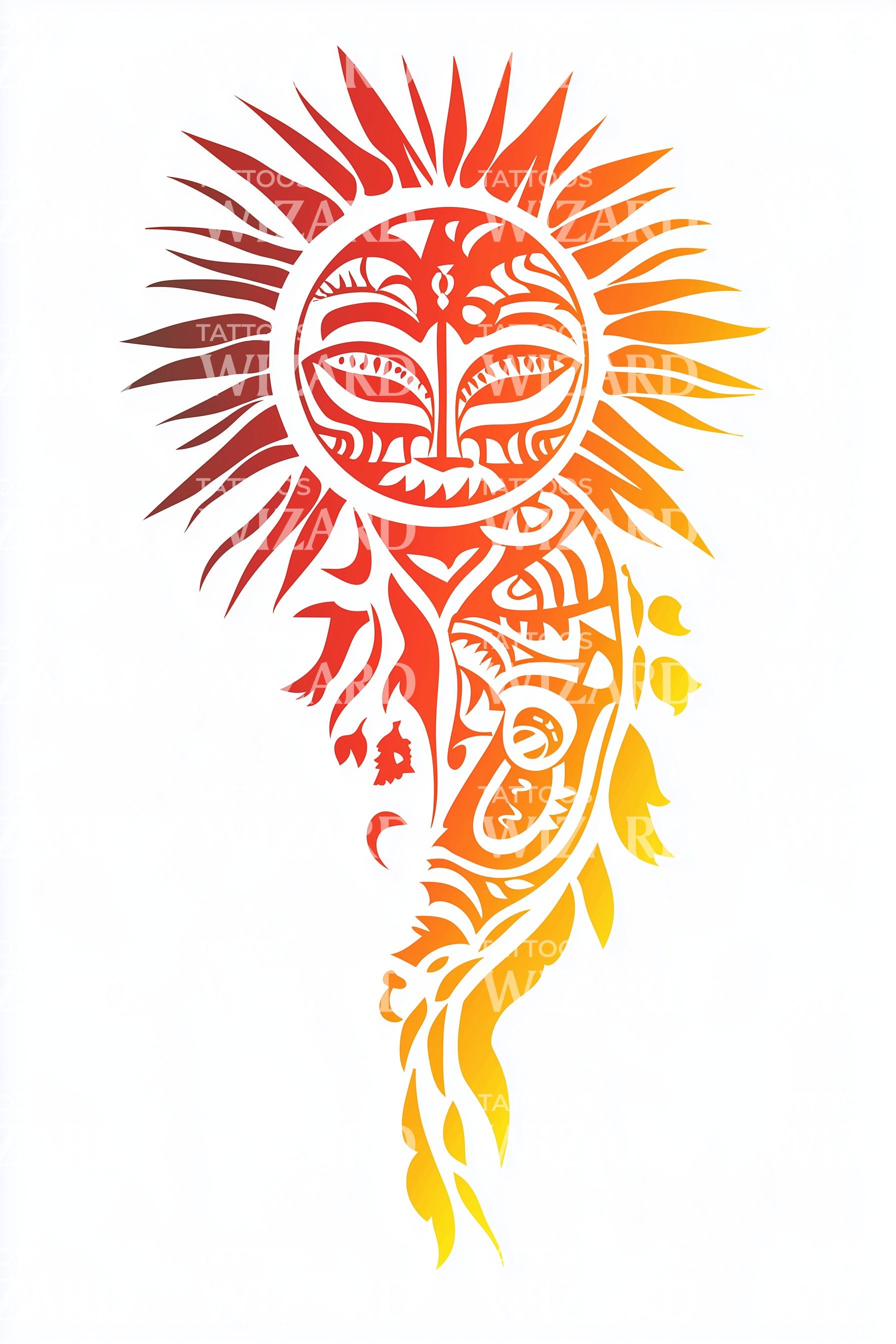 Освободите своего внутреннего воина с нашим дизайном татуировки в стиле племени, объединяющим символические элементы солнца, маски и огня. Этот исключительный узор отражает солнечную энергию и включает сложные племенные орнаменты вокруг сияющего лица — яркое воплощение храбрости и силы, которое вы можете носить на своей коже.