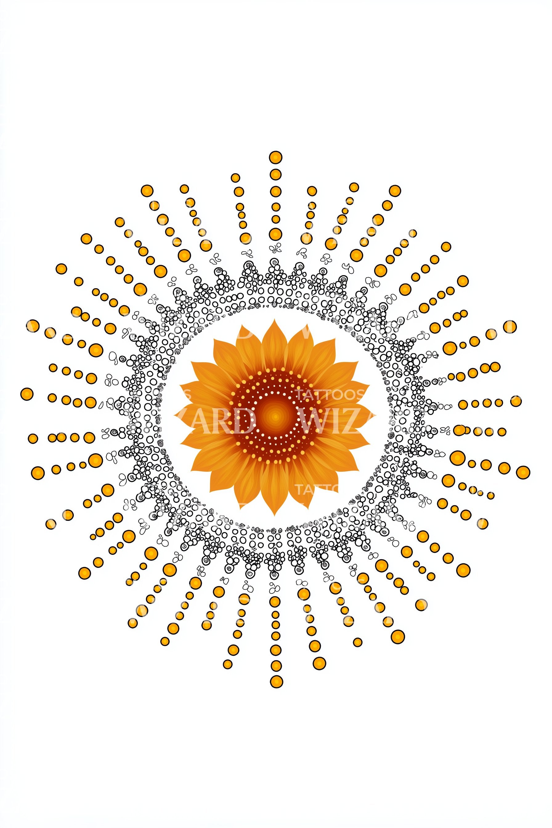 Этот поразительный дизайн тату мандалы излучает чистую энергию, в центре которого находится завораживающий солнечный луч. Тонкая точечная работа изображает симметричные лучи и лотосы, которые тщательно закручиваются наружу, воплощая духовную гармонию. Идеально подходит для тех, кто ищет уникальный символ, излучающий позитив и свет.
