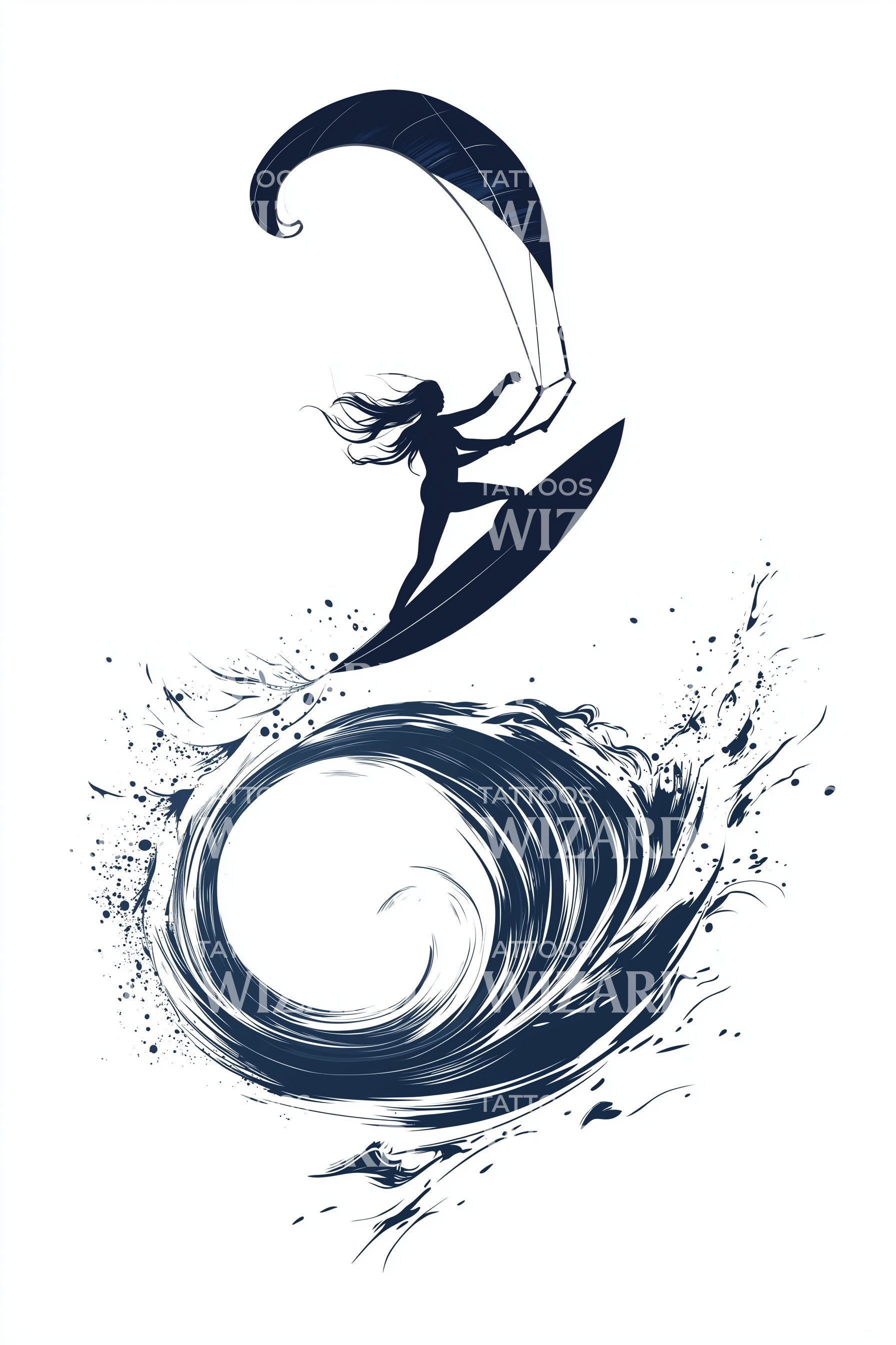 Темные акварельные завитки прилива образуют спиральную волну, над которой парит кайтер. Символ потока, обновления и укрощенной энергии, он шепчет о смелости в переменах. Ощущается текучим и яростно свободным. Идеальные места для тату: обхват предплечья для спирали; ребра для вертикального движения; лопатка для воздушного движения; икра для длинного завитка.