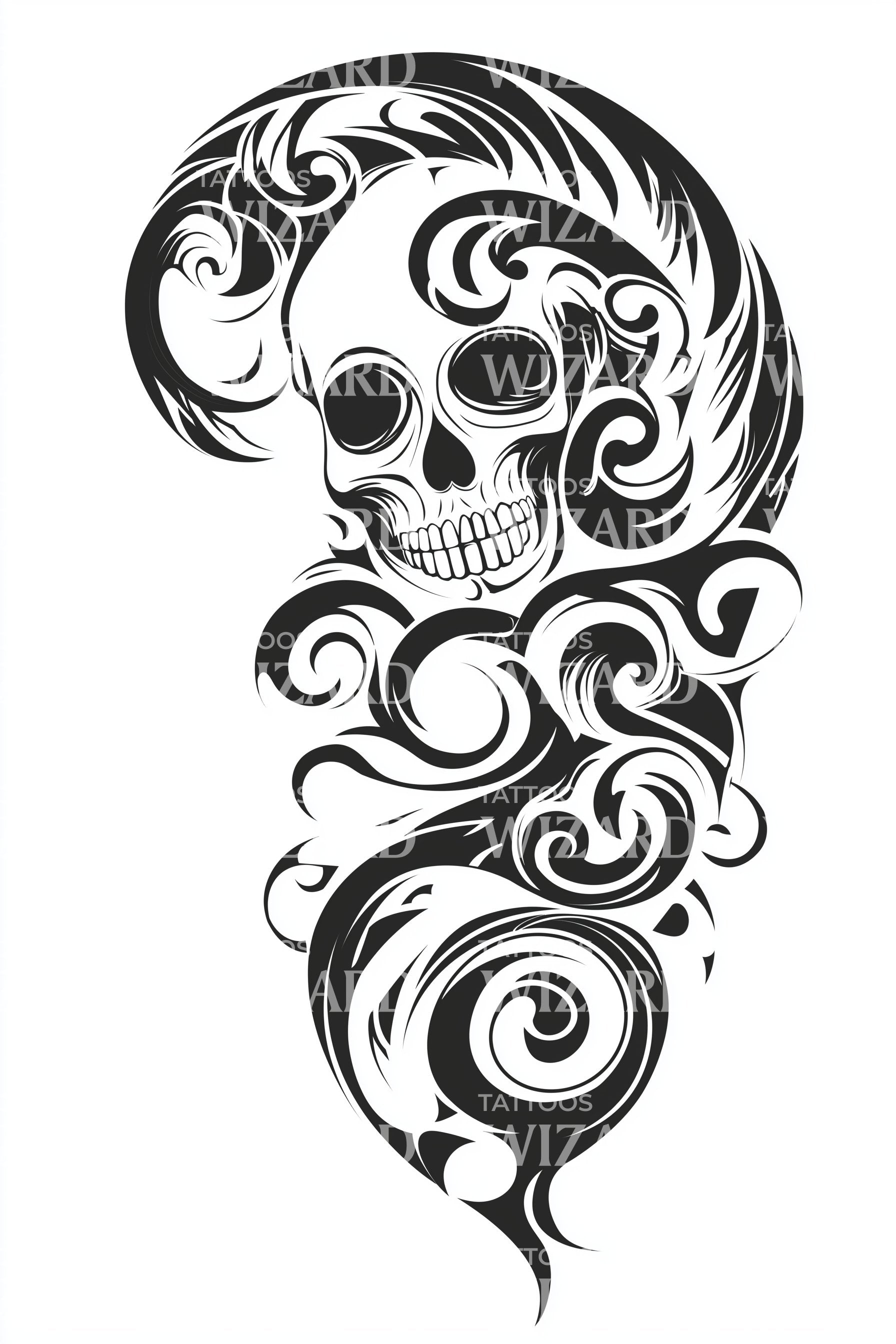 Погрузитесь в красоту бренности с этим элегантным черным тату дизайном черепа. Украшенный изящными завитками, он воплощает декоративный штрих, излучая уникальное очарование. Этот дизайн прекрасно сочетает мрачное с художественным, орнаментальным стилем, делая его идеальным выбором для любителей татуировок.