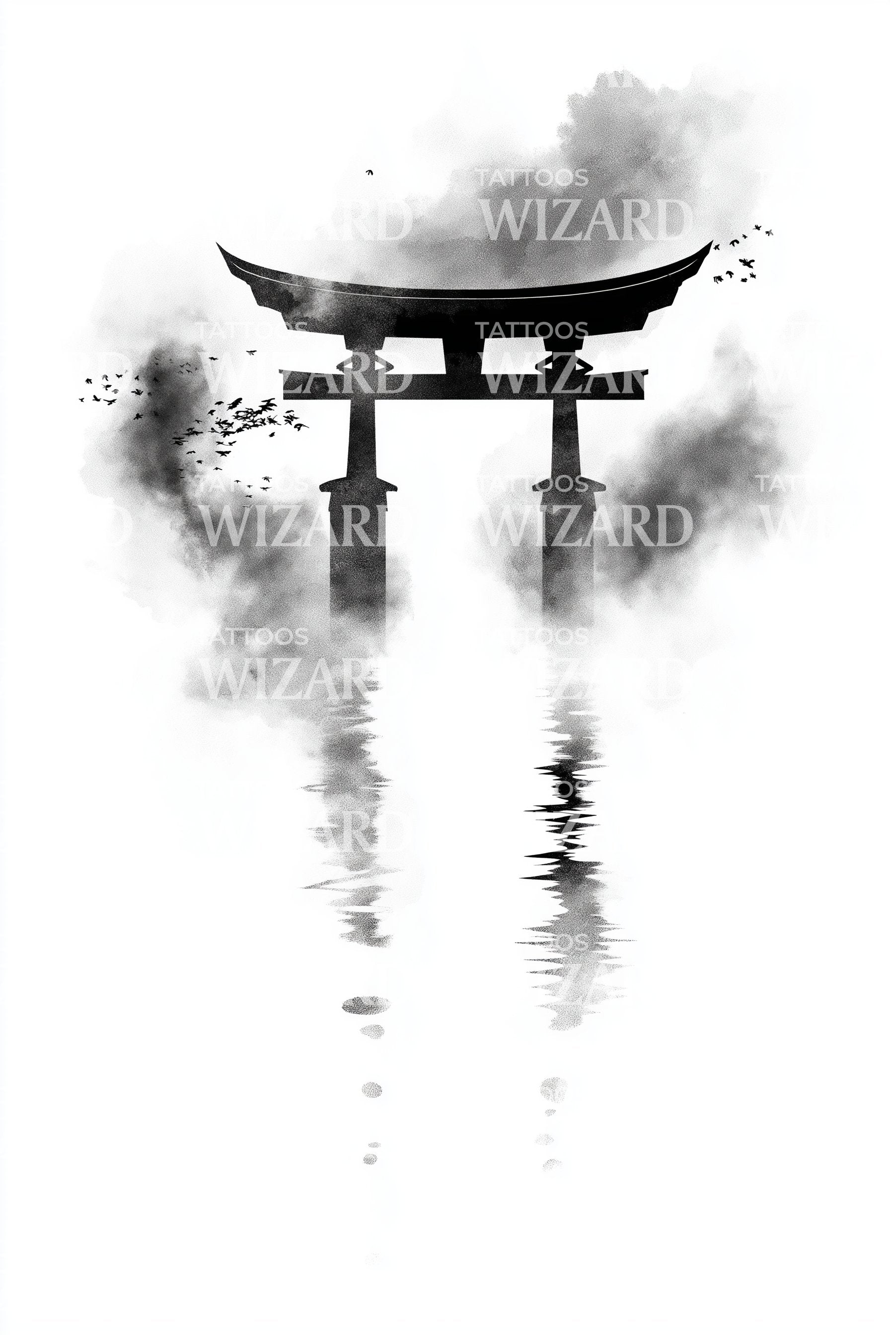 Погрузитесь в спокойствие с этим тату-дизайном, вдохновлённым дзен. Прекрасно изображая тории, он выполнен изумительными акварельными мазками, создающими эфирный эффект тумана и отражения. Этот шедевр воплощает умиротворение, чтобы сопровождать вас на пути к внутреннему покою.