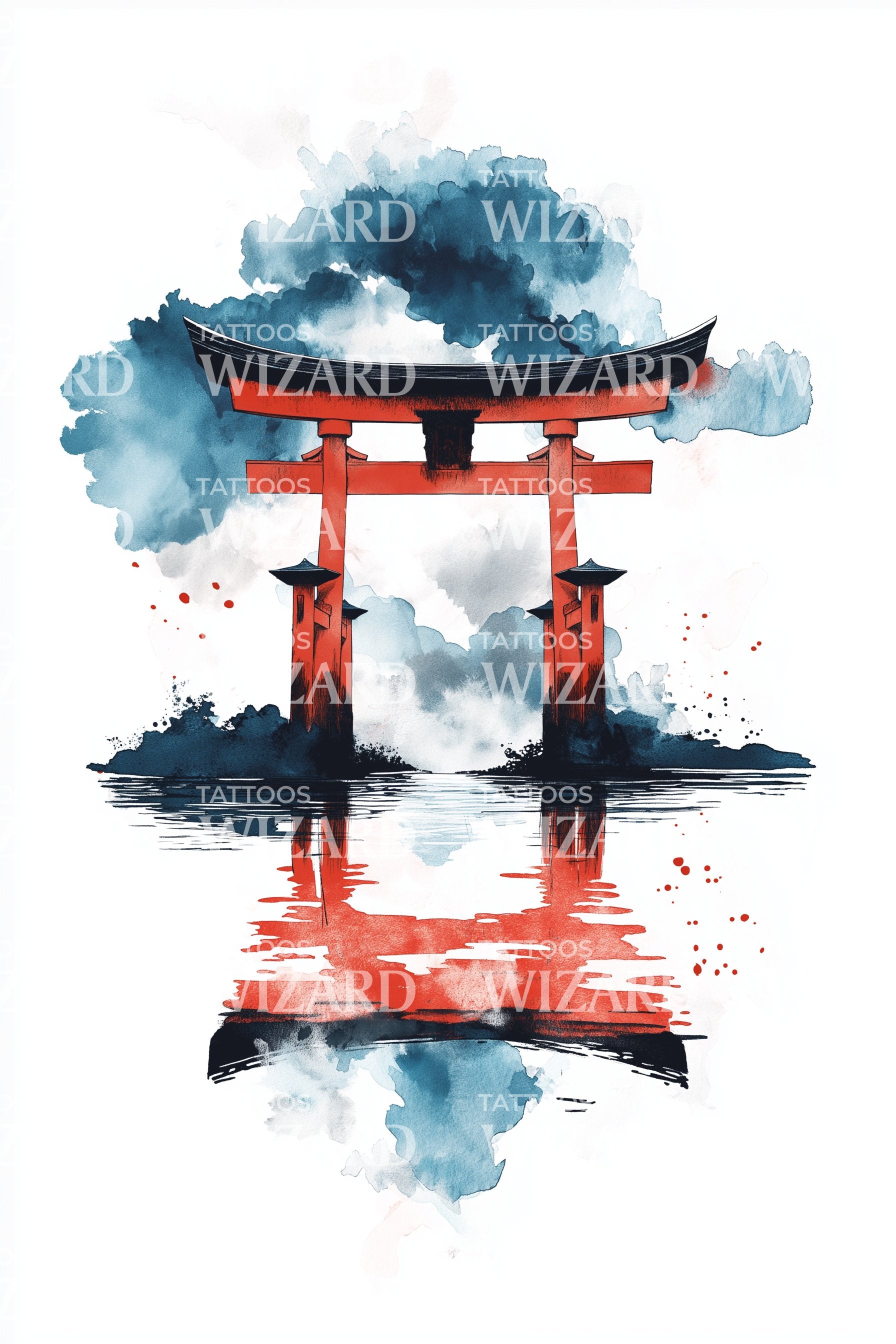 Ощутите спокойную красоту Японии с этим акварельным тату-дизайном. Он изображает зеркальное отражение традиционных ворот Тории, выполненное в потрясающем акварельном стиле. Успокаивающая палитра и умиротворяющий пейзаж принесут в вашу повседневную жизнь частичку восточной гармонии.