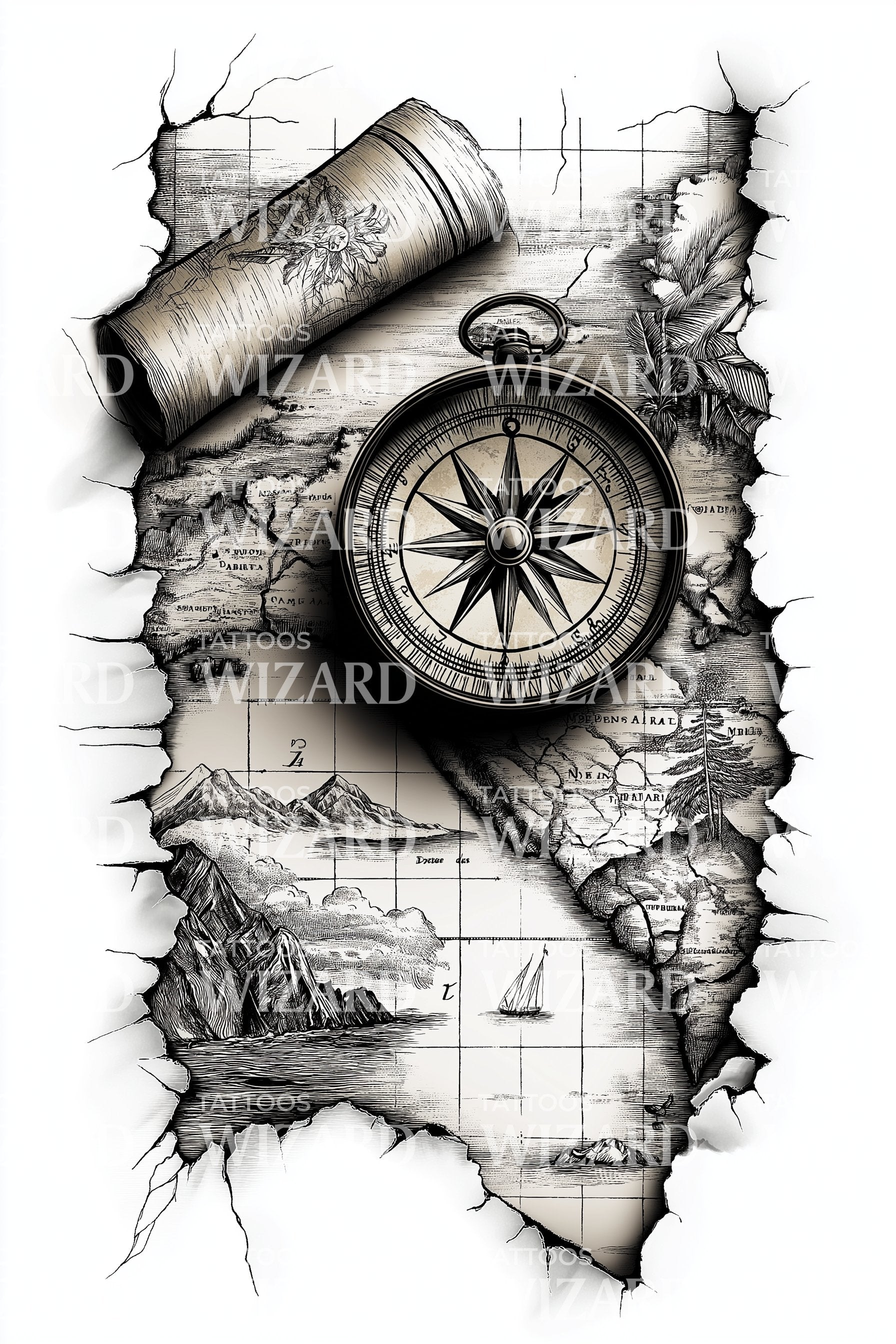 Освободите своего внутреннего моряка с этим тату-эскизом в антикварном морском стиле. С изображением порванной карты и искусно выполненного компаса, он идеально отражает вашу страсть к путешествиям. Благодаря своему грубому и набросочному виду, этот дизайн отдает дань историческим морским приключениям.