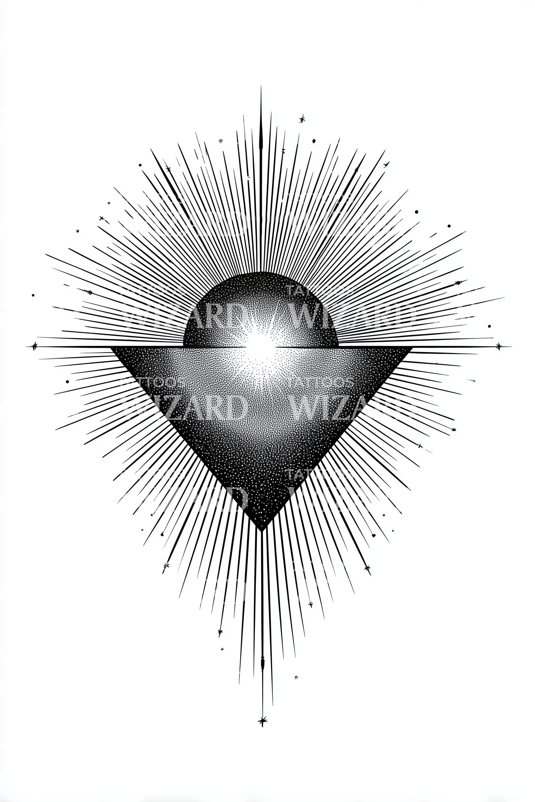 Погрузитесь в завораживающее сочетание геометрии и космических элементов с этим дизайном татуировки в стиле blackwork. В центре внимания — завораживающее солнце и чарующее затмение, переплетённые внутри идеального треугольника; этот дизайн создаёт совершенный баланс между сиянием и тенью. Это превосходный выбор для ценителей сложных узоров и космической символики.