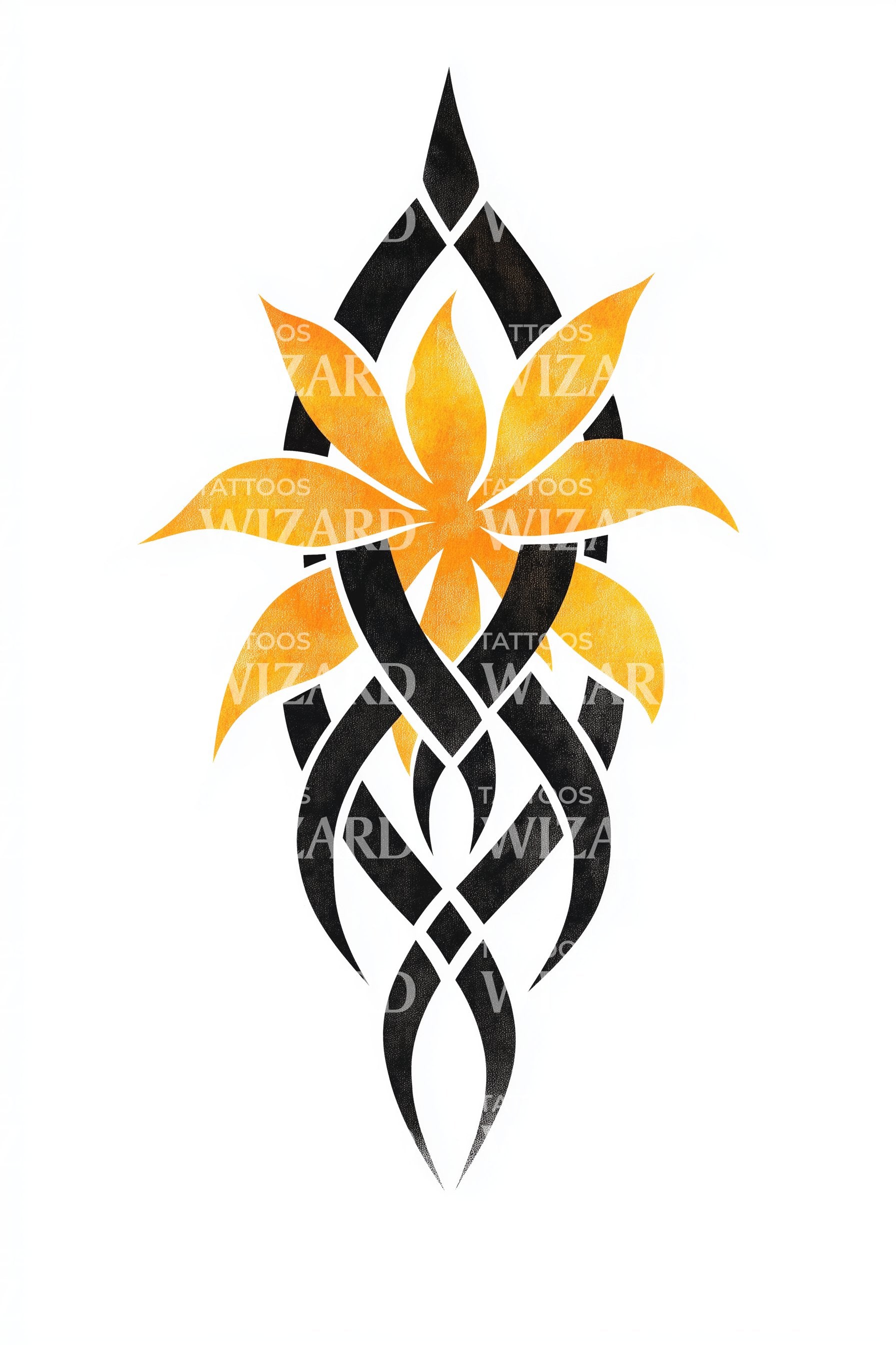 Погрузитесь в мистическую привлекательность с этим смелым татуировочным дизайном в стиле трайбл. Безупречно вырезанный глубоким чёрным цветом, этот узор сочетает изящные лилии и звездные созвездия в художественном слиянии. Дизайн выражает мощное заявление индивидуальности, одновременно отдавая дань традиционной трайбл эстетике.