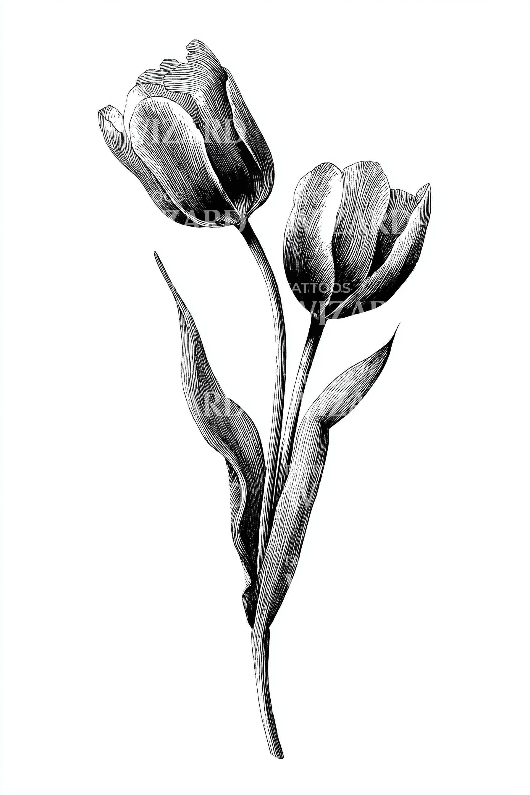 Twin tulips rendered in fine blackwork rise on slender stems, petals shaded with delicate hatching and leaves flowing like silk. A pair for balance and devotion, they honor spring’s return, quiet resilience, and shared growth. Worn on skin, this botanical whispers grace, tenderness, and steadfast beginnings every day.