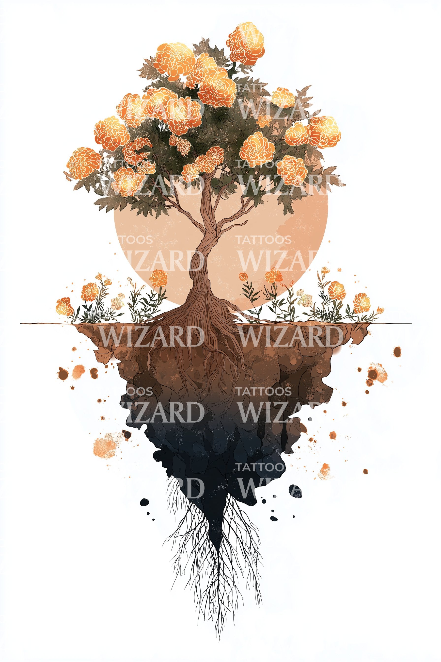 Погрузитесь в сюрреалистическую красоту этого акварельного тату-дизайна. Он художественно изображает плавающий остров с цветущими цветами под двумя солнцами. Его яркие цвета и уникальные образы обладают завораживающим очарованием. Эта работа прекрасно балансирует между реальностью и мечтами, создавая идеальное тату-шоу.
