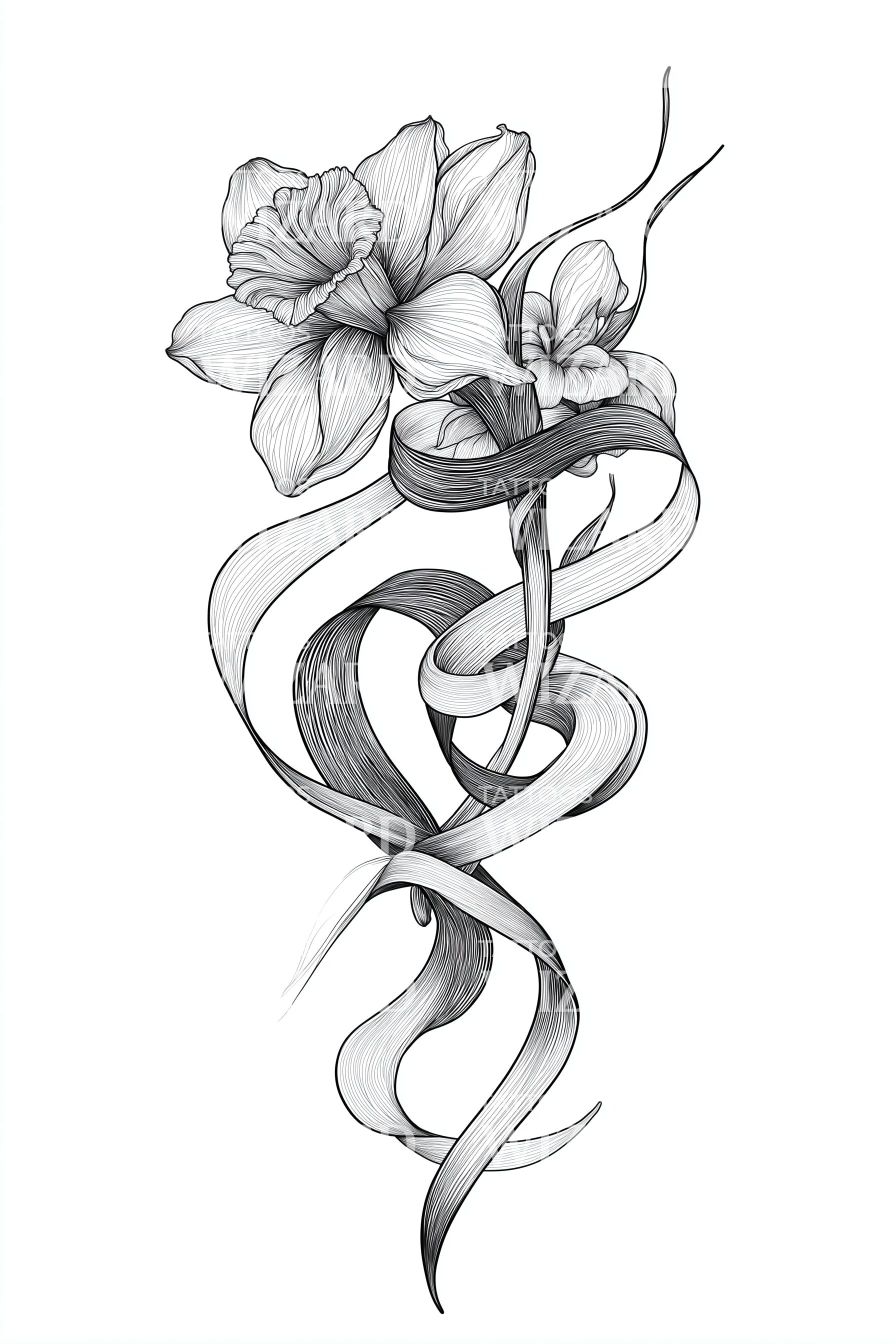 Этот иллюстративный дизайн татуировки демонстрирует красоту переплетающегося нарцисса, украшенного изящными завитками. В дизайне присутствует прекрасная переплетающаяся лента, подчеркивающая цветочные элементы. Орнаментальные детали придают изысканность, делая его уникальным шедевром для любителей татуировок.