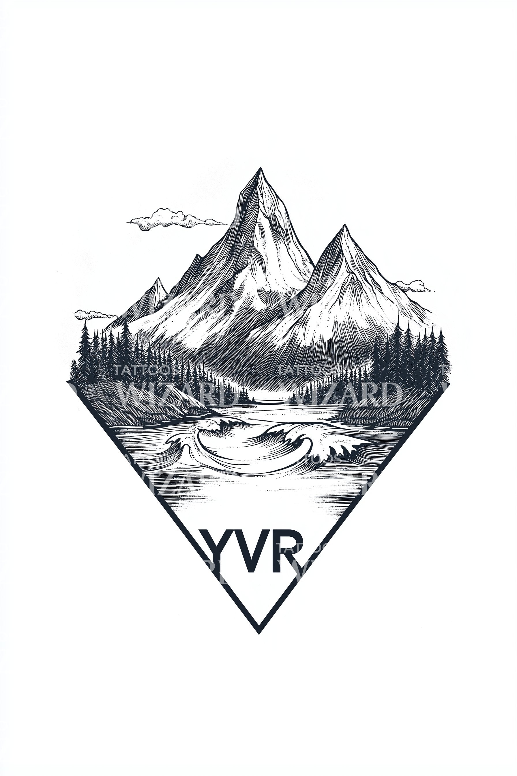Microrealist badge captures Vancouver’s YVR with crisp inked peaks, misted clouds, fir-lined shores, and tidal swirls framed within a sharp diamond. Mountains symbolize endurance; waves speak of arrival and departure; forest keeps memory. Worn daily, it feels like cool Pacific air, grounding wanderlust and honoring Canada’s coastal home.