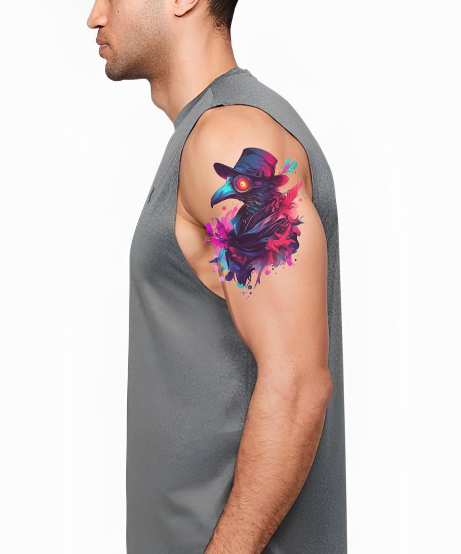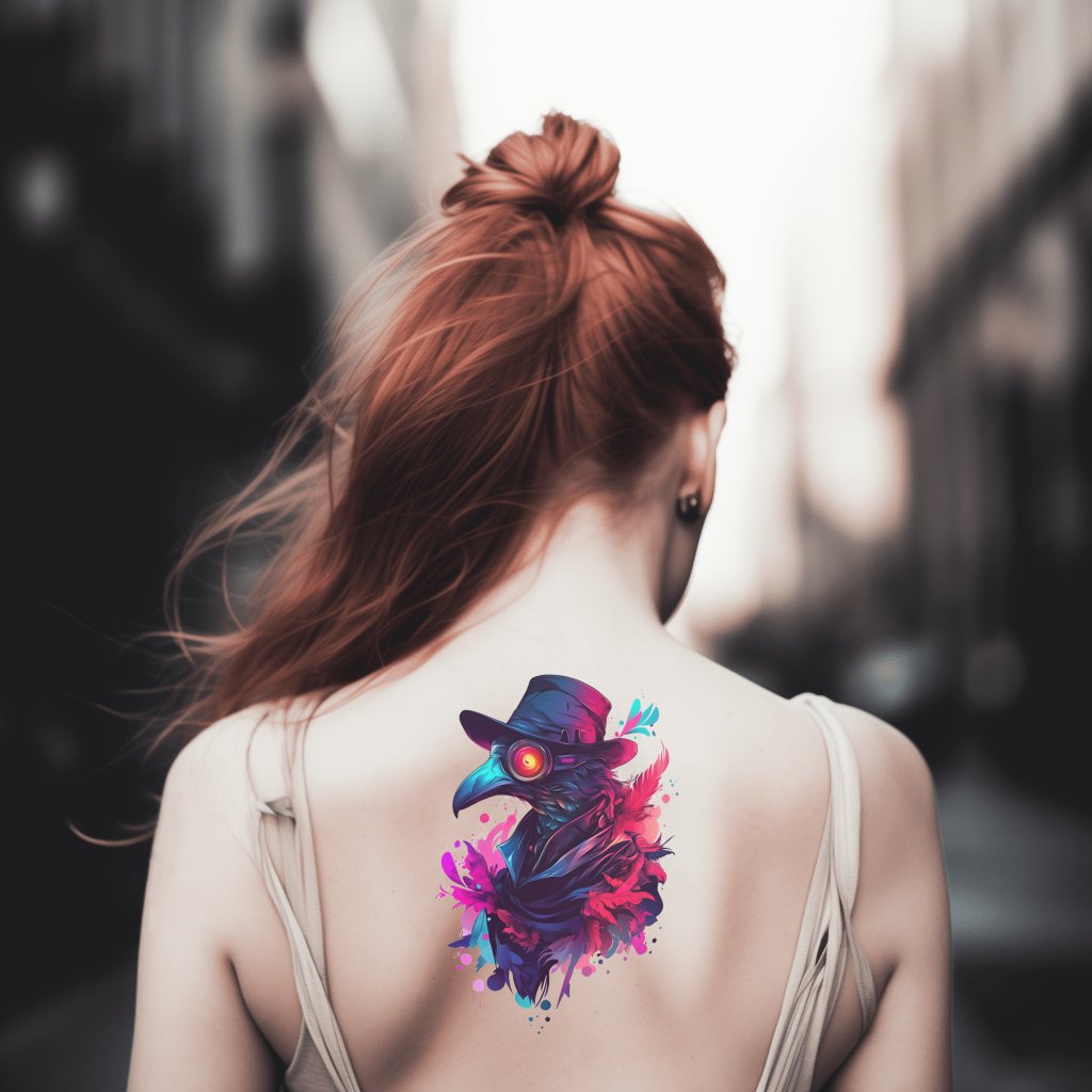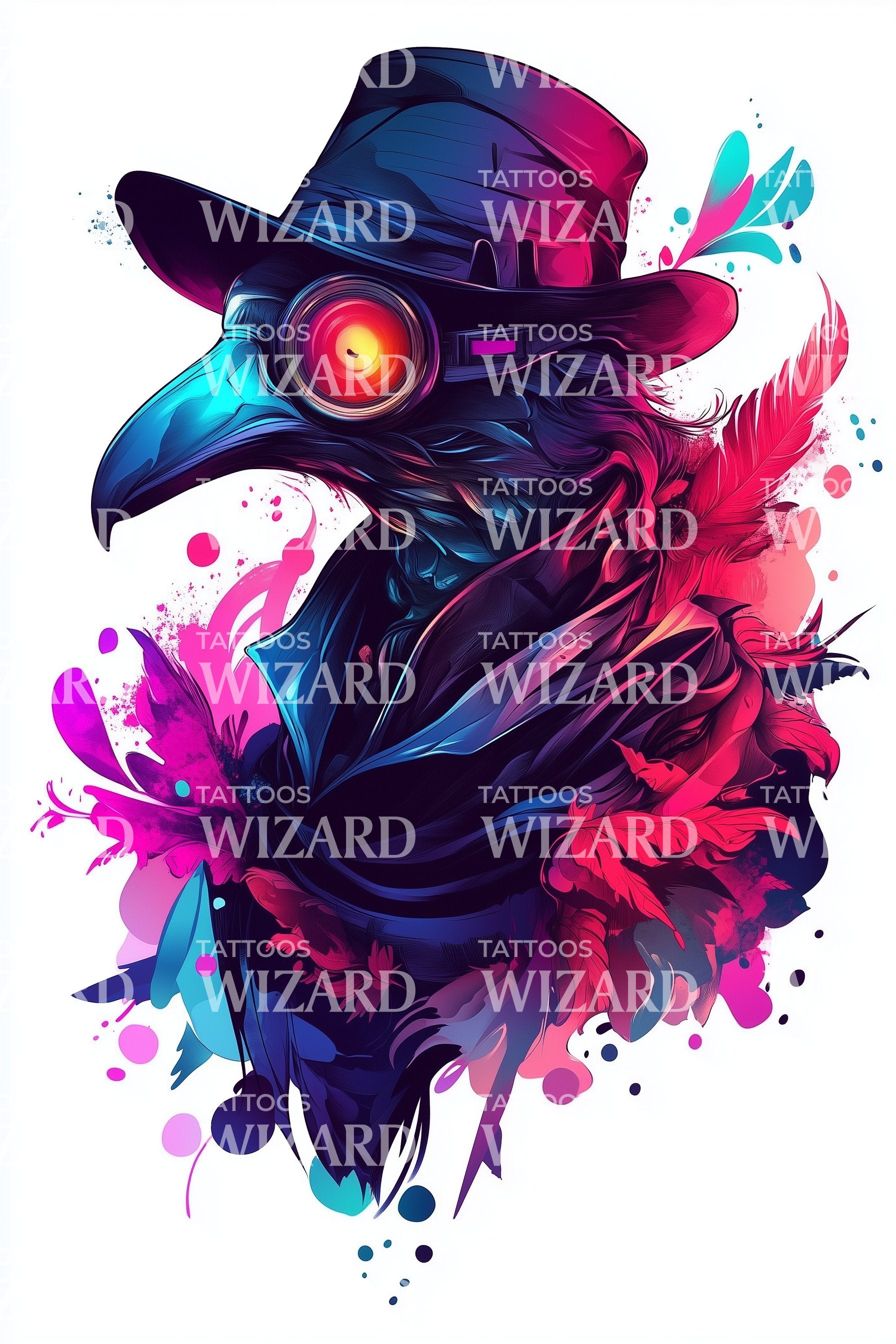 Погрузитесь в увлекательное сочетание прошлого и будущего с этим тату-дизайном новошкольного доктора чумы. Он блестяще объединяет эстетику vaporwave с неоновыми элементами, воплощая футуристический рассказ. Этот шедевр идеально передаёт загадочность эпохи чумы, предлагая визуально впечатляющий контраст истории и современности.