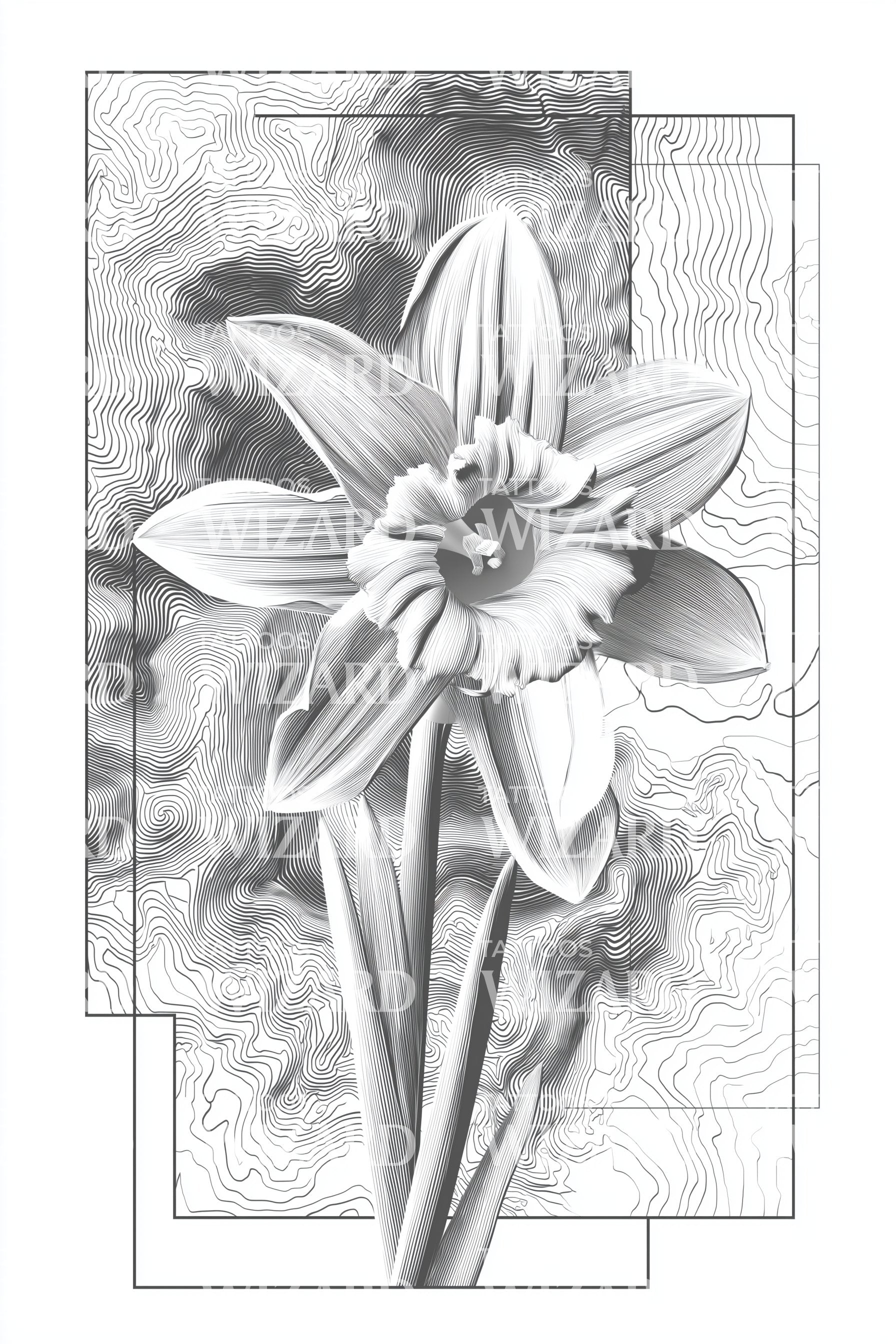 Погрузитесь в этот тату-дизайн в винтажном стиле, демонстрирующий изящно вырезанные нарциссы, заключённые в классическую рамку. Великолепное сочетание очарования старого мира и цветочной элегантности, этот иллюстративный арт-объект является образцом вечной красоты. Идеально подходит для тех, кто ценит величие в простоте.