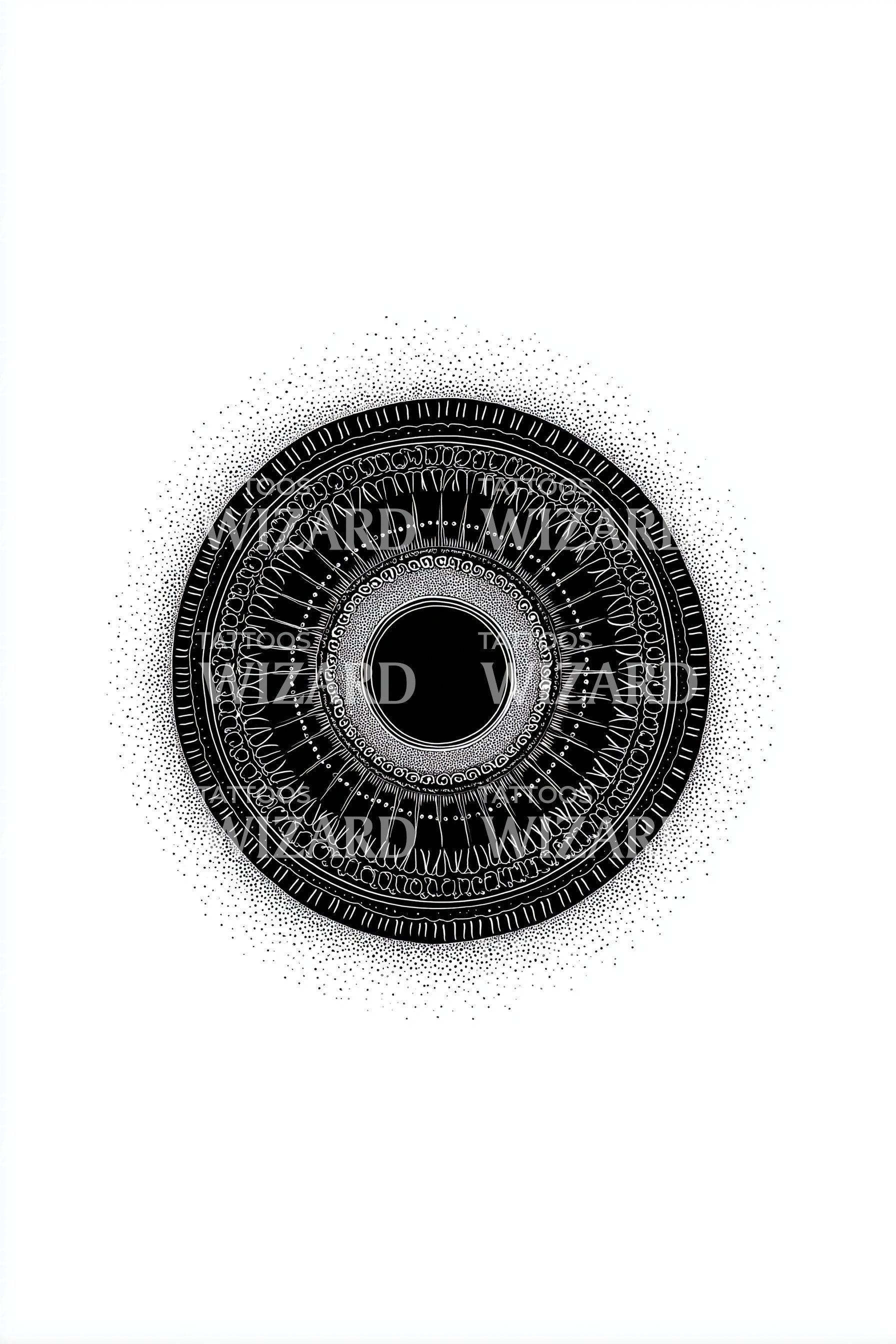 Откройте для себя глубокое чувство сосредоточенности с этим тату-дизайном в стиле дзен. В центре — замысловатая мандала в виде пустого круга, тщательно выполненная динамичной точечной техникой, которая передаёт одновременно спокойствие и силу. Этот уникальный рисунок — воплощение умиротворения, призванное усилить вашу связь с внутренним покоем и концентрацией.