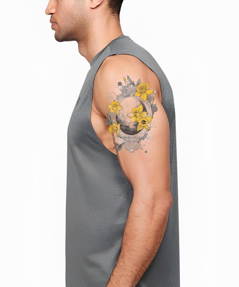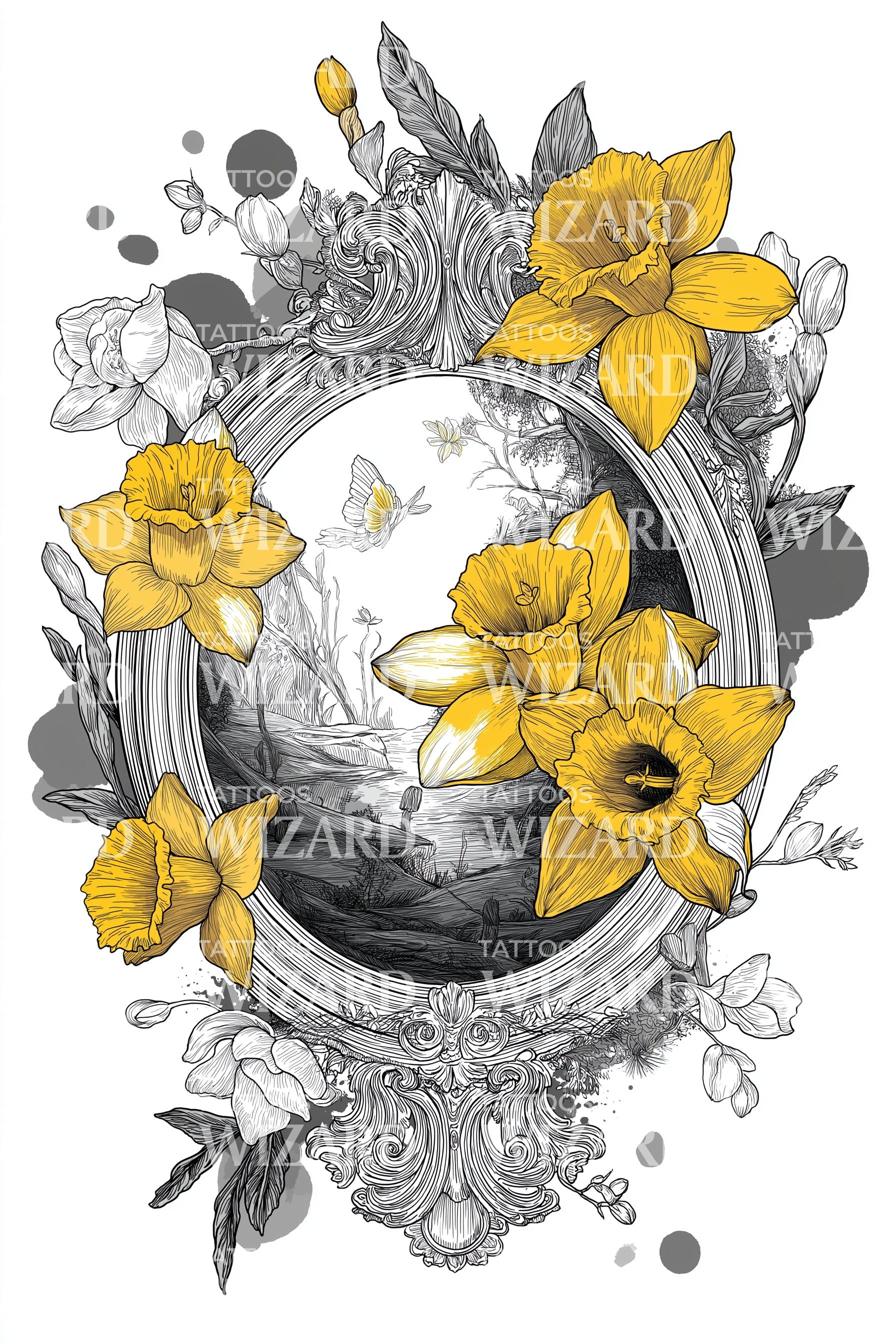 Погрузитесь в дух приключений с этим орнаментальным дизайном татуировки. Вдохновлённый морем, он изображает величественный антикварный корабль, окружённый роскошной рамкой из ярких нарциссов. Истинная дань морской эстетике и наследию, он идеально подходит тем, кто жаждет путешествий.