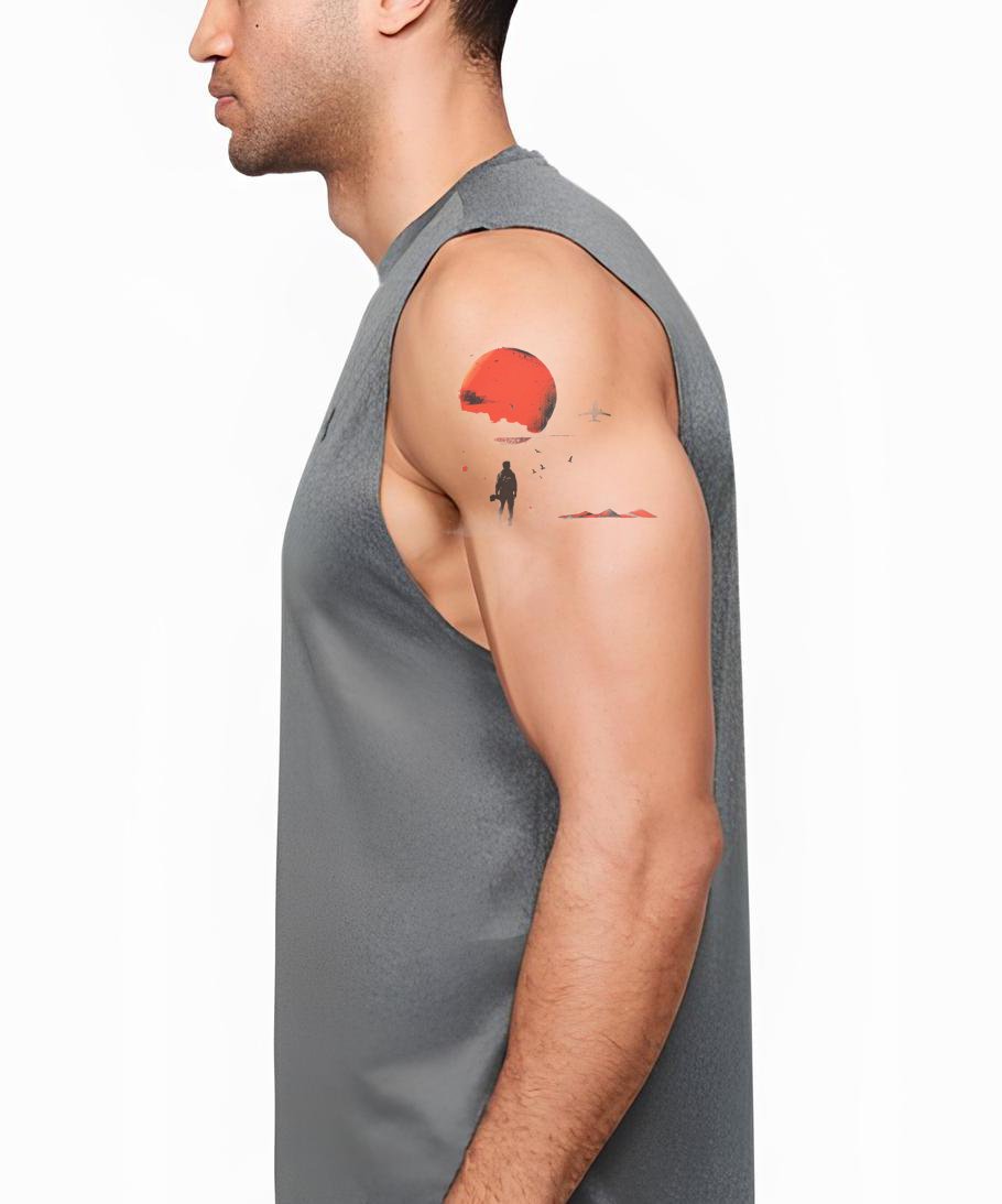 Погрузитесь в мир исследований с этим иллюстративным дизайном татуировки. Сцена, окрашенная в тёплые оттенки заката, включает самолёт, птиц и завораживающий пейзаж. Она идеально воплощает дух жажды путешествий, делая этот дизайн идеальным выбором для путешественников и исследователей.