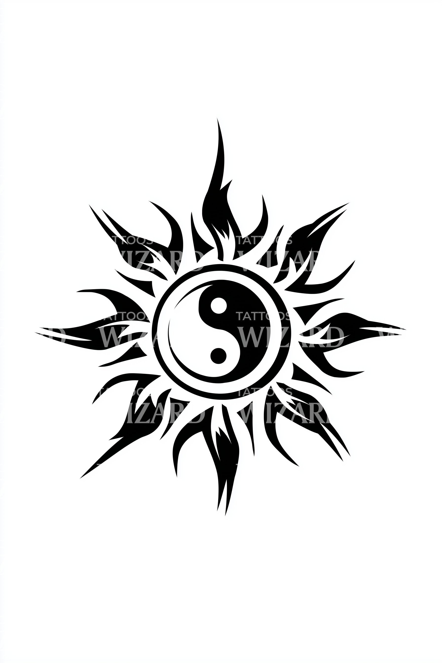 Ощутите гармонию инь и ян с этим тату-дизайном в стиле трайбл. Переплетённый с солнечными мотивами, он символизирует баланс и энергию. Излучая первобытную эстетику, это творение органично сочетает традиционные племенные узоры с ключевыми символами космического равновесия. Идеально подходит тем, кто ищет эмблему личной силы.
