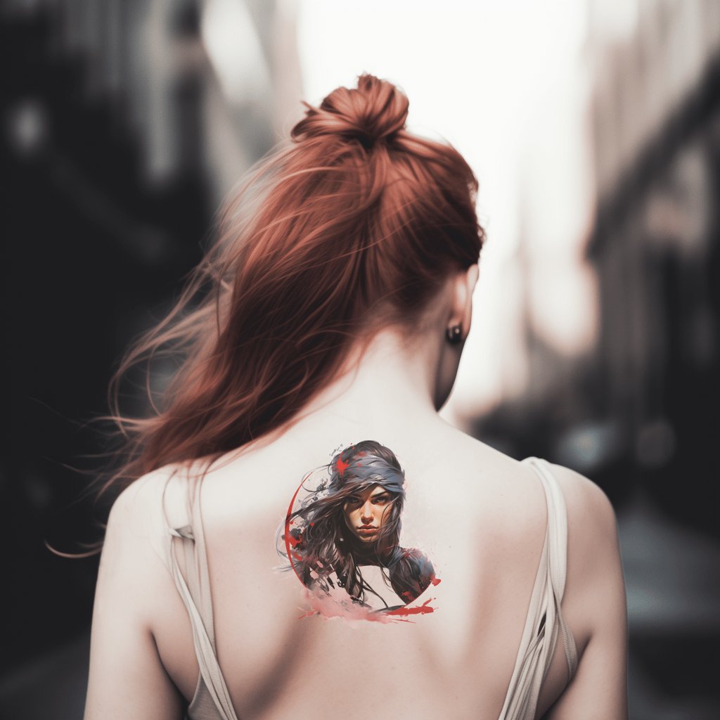 Dyk in i underverkens universum med vår unika, anime-inspirerade Elektra-tatuering. Designen framhäver en stark, rebellisk kvinna och integrerar illustrativa element från superhjältar. Den är perfekt för dig som dras till anime-stilen och som omfamnar din inre rebell.