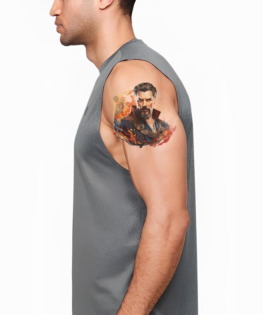 Fånga din kärlek till Marvels mystiska världar med vår illustrativa Doctor Strange Anime Tattoo-design. Genom att förena japansk animationsstil med superhjältecharm, visar detta verk ett dramatiskt cirkulärt motiv som förkroppsligar människans mod. Omfamna din inre krigare med denna unika, samtalsstartande hudkonst.