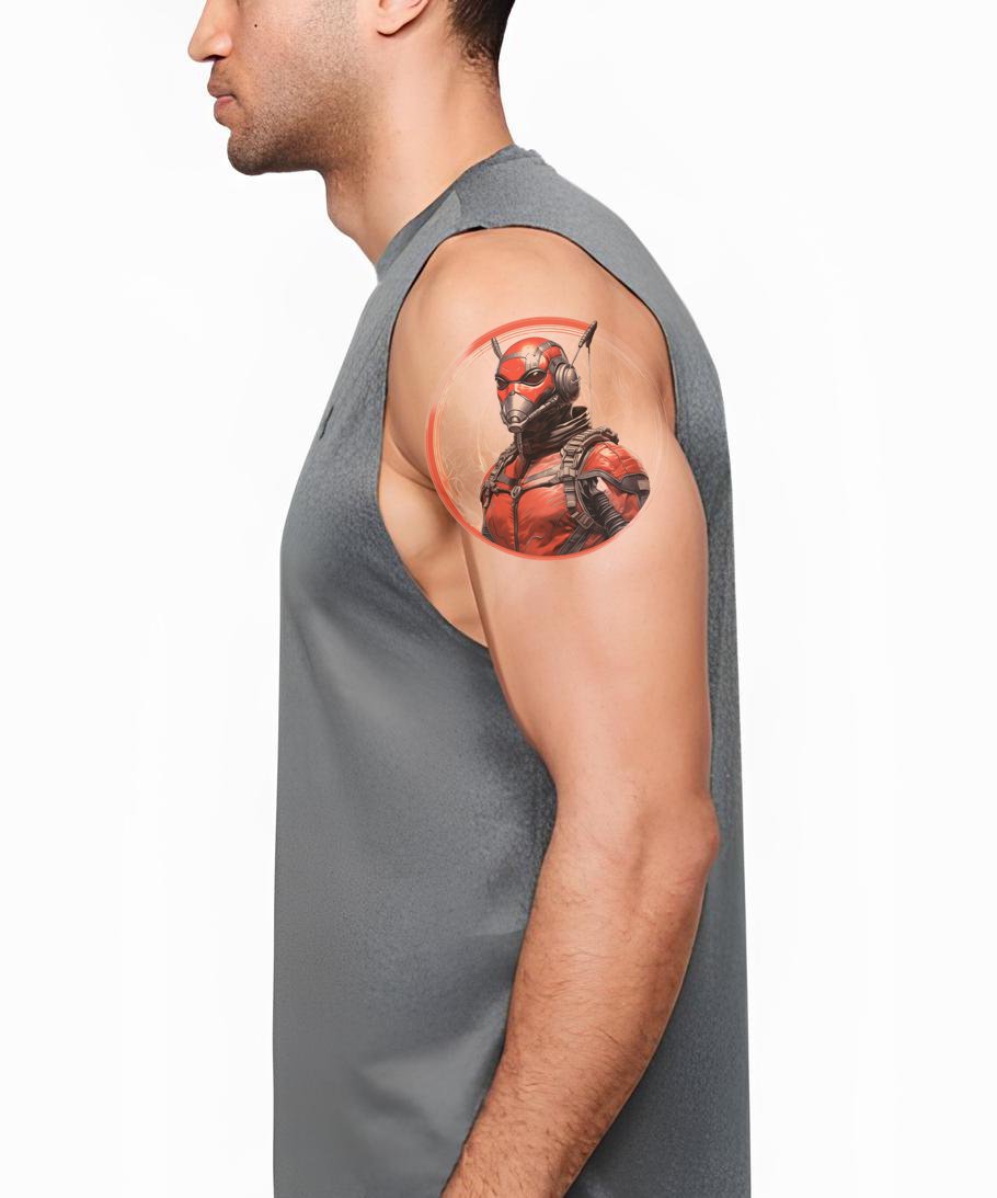 Upplev de oändliga superkraftsvibbarna med denna unika tatuering inspirerad av Antman. Detta verk förenar perfekt illustrativ animekonst med ikoniska Marvel-superhjältar. De intrikata detaljerna skapar ett förtrollande cirkelmönster som skildrar en man-maskin-berättelse. Den perfekta fusionen för anime- och Marvel-fantaster!