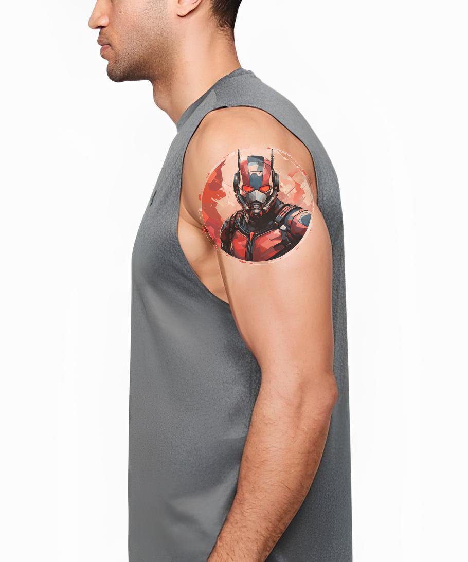 Fördjupa dig i fantasin om Marvel-superhjältar med denna unika Anime Antman-tatuering. Den förenar skickligt Antmans maskulinitet med en touch av Animes eteriska charm. En perfekt fusion av människa, maskin och illustrativ konst, inramad i en fängslande cirkelform. Idealisk för fans av radikal kroppskonst.
