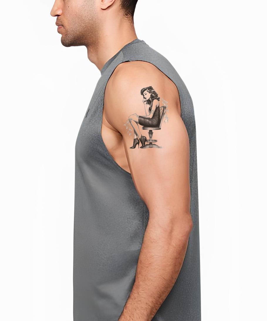 När du låter din passion för bläck flöda med denna smakfullt intrikata svart&grå tatuering. Föreställ dig den fängslande pin-up tatuering konstnären, elegant prydd med en antik stol och hisnande rosor. Perfekt för alla tatuering entusiaster och kännare, som tillför en tidlös touch av konstnärligt uttryck till din samling.