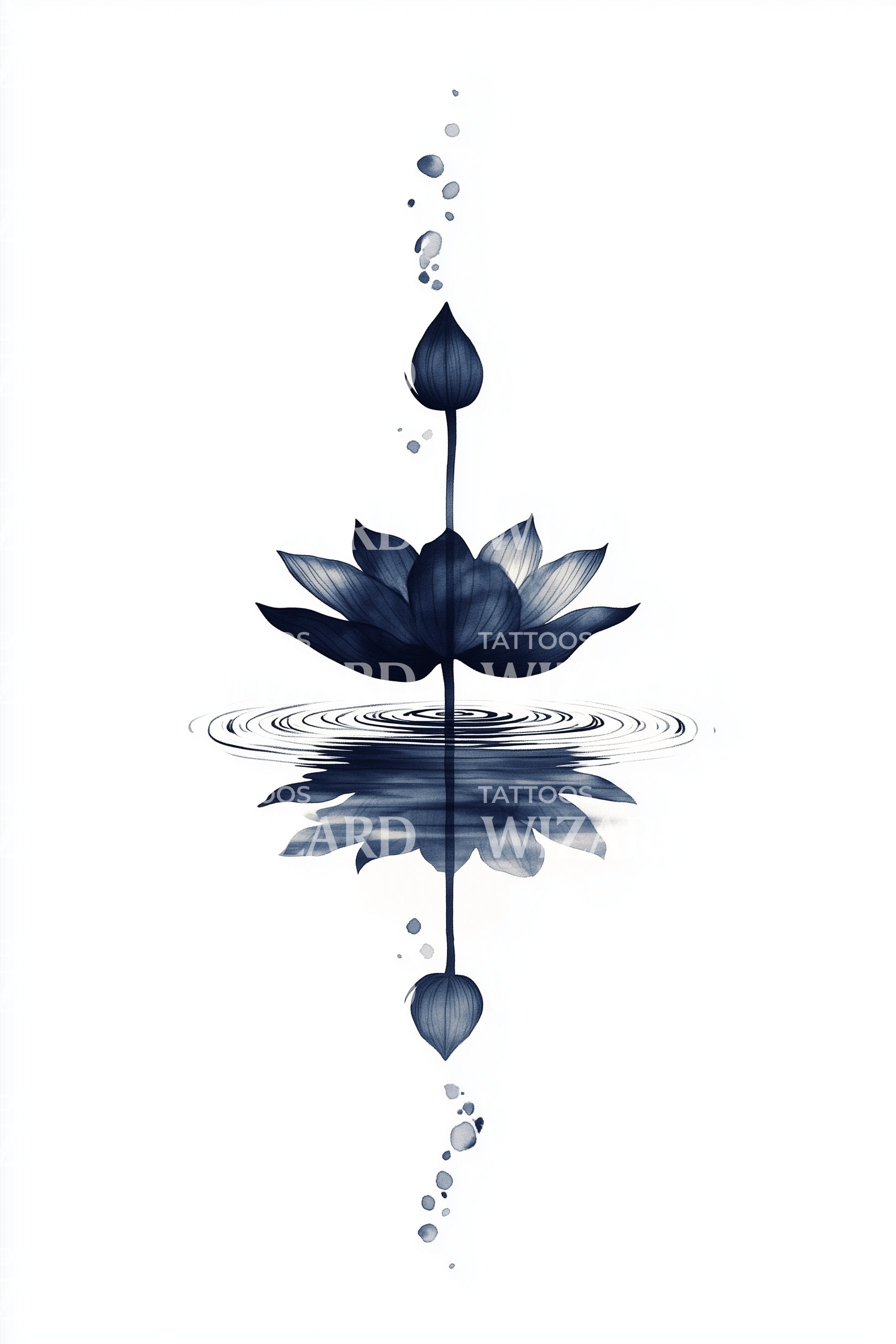 Fördjupa dig i den lugna skönheten hos denna akvarelltatuering med en fängslande blå lotus. Den charmiga essensen av reflektion och ömtåliga droppar förstärker dess lockelse och speglar naturens fridfulla skönhet. Det är ett blomsterverk perfekt för dig som dras till unika, eteriska estetiker.