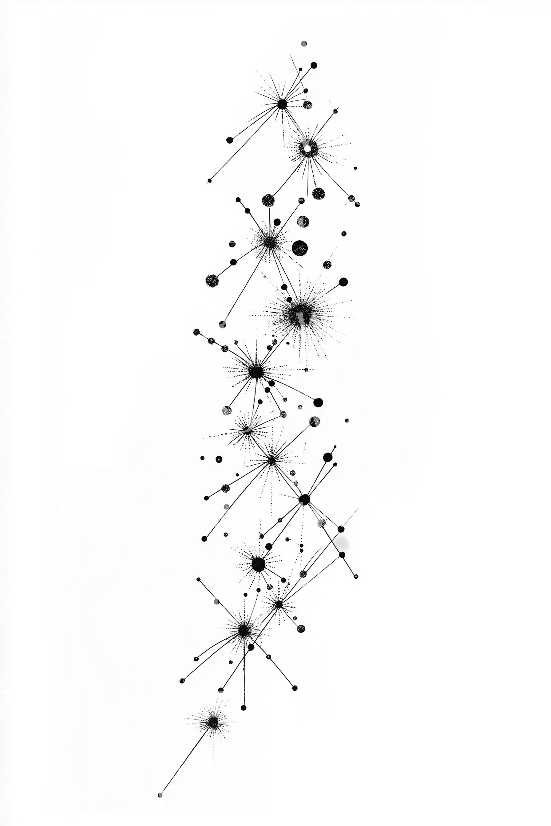 Cosmic dotwork constellations cascade along the spine, a galaxy of stippled stars, orbits, and lines in delicate alignment. Abstract bursts ripple like supernovas, connected by fine dots that hum with motion. Worn on the body, it feels like gravity and light agreeing, centering courage and quiet wonder within.