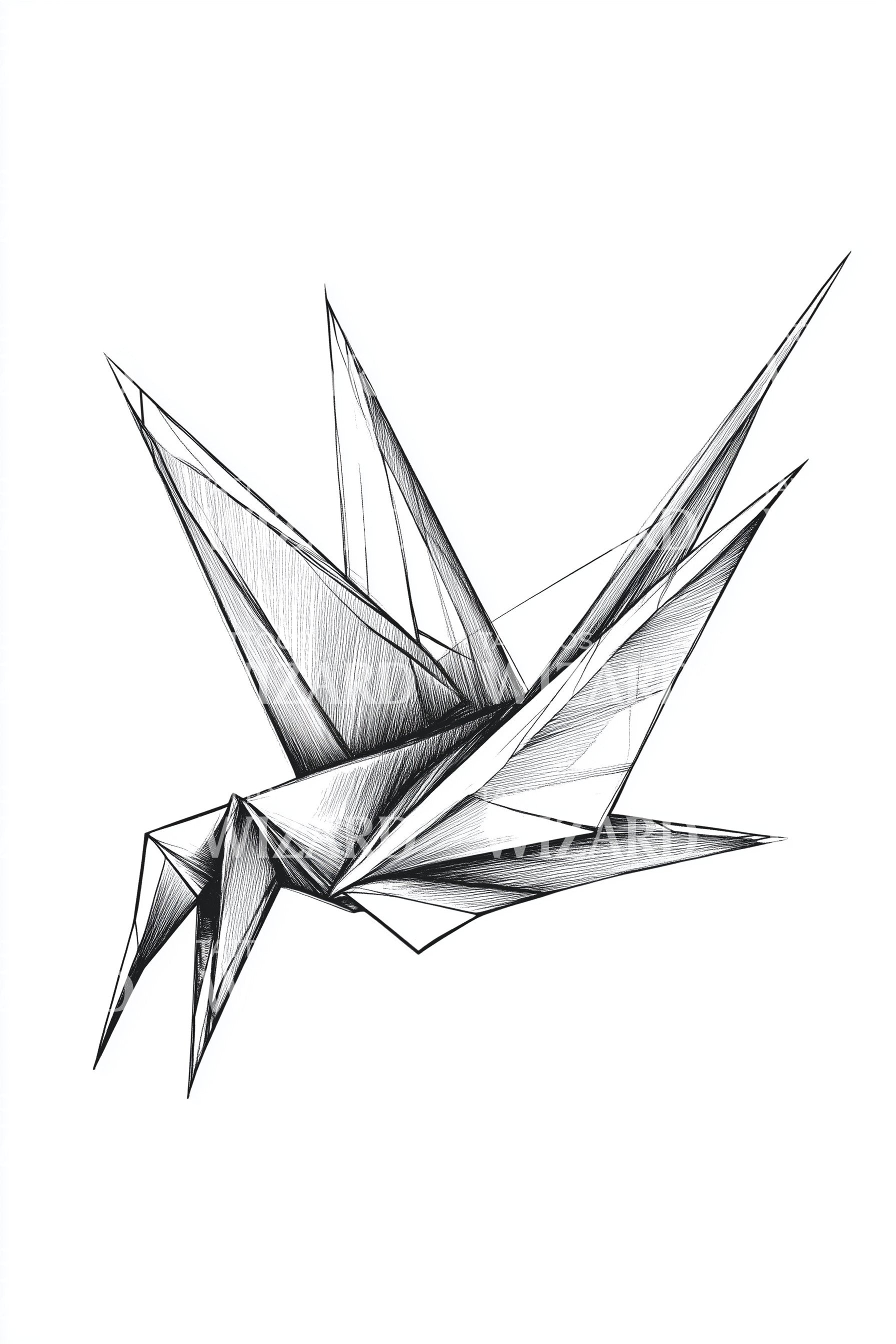 Släpp loss din inre konstnär med denna moderna geometriska trantatuering. Med en kantig, origamistil, förenar denna estetiskt tilltalande fågelform briljant enkelhet med komplexitet. Det är mer än bara en tatuering, det är en samtalsstartare. Andas in den nya tiden med detta konstverk.