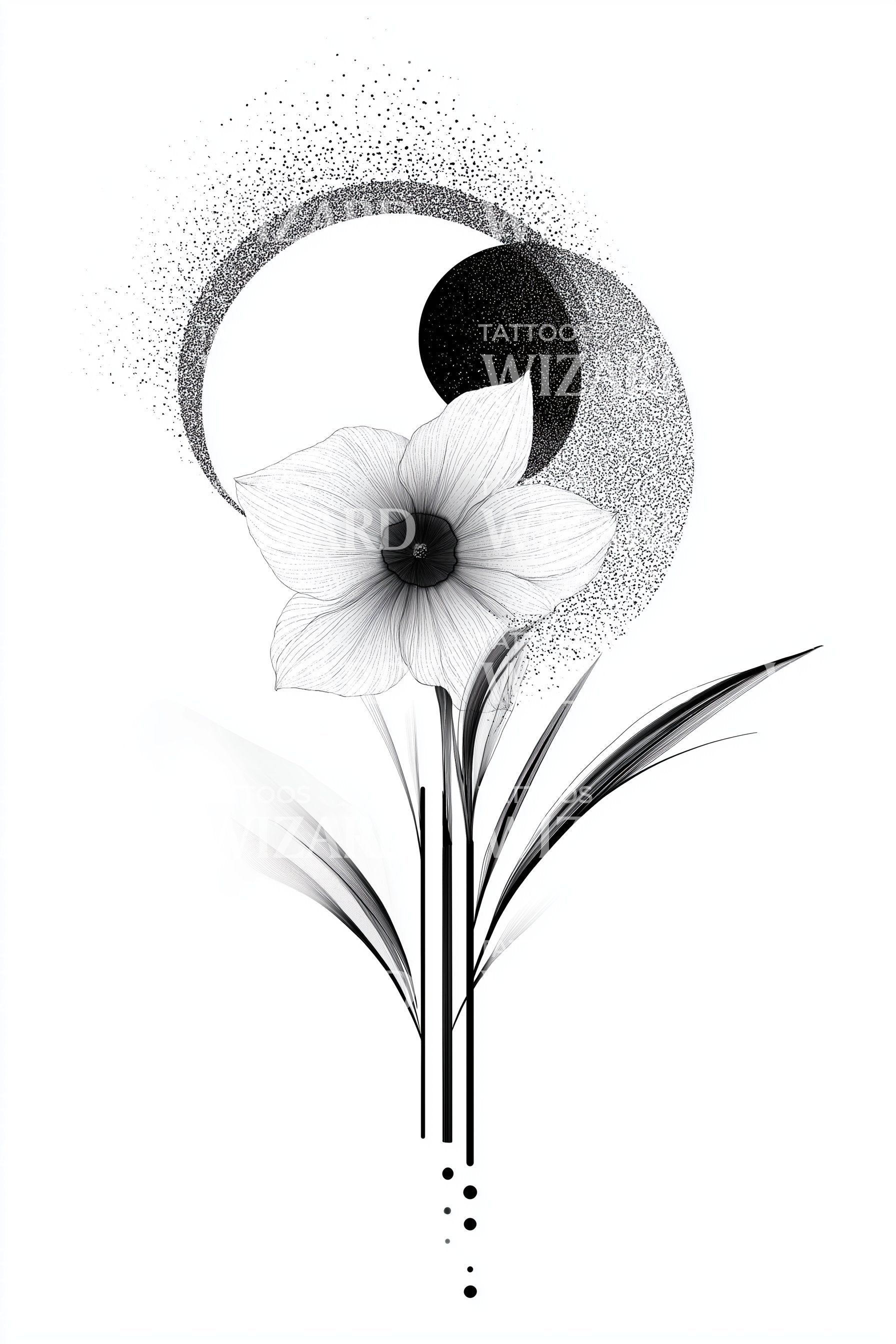 Upplev månens mystik i skenet av månsken med denna eleganta dotwork-tatuering. Intrikata skuggor smälter sömlöst samman med geometriska mönster och skapar en eterisk halvmåne prydd med blommor. Denna tatuering förstärker inte bara din stil utan väcker också en förtrollande berättelse om himmelsk skönhet och botanisk charm.