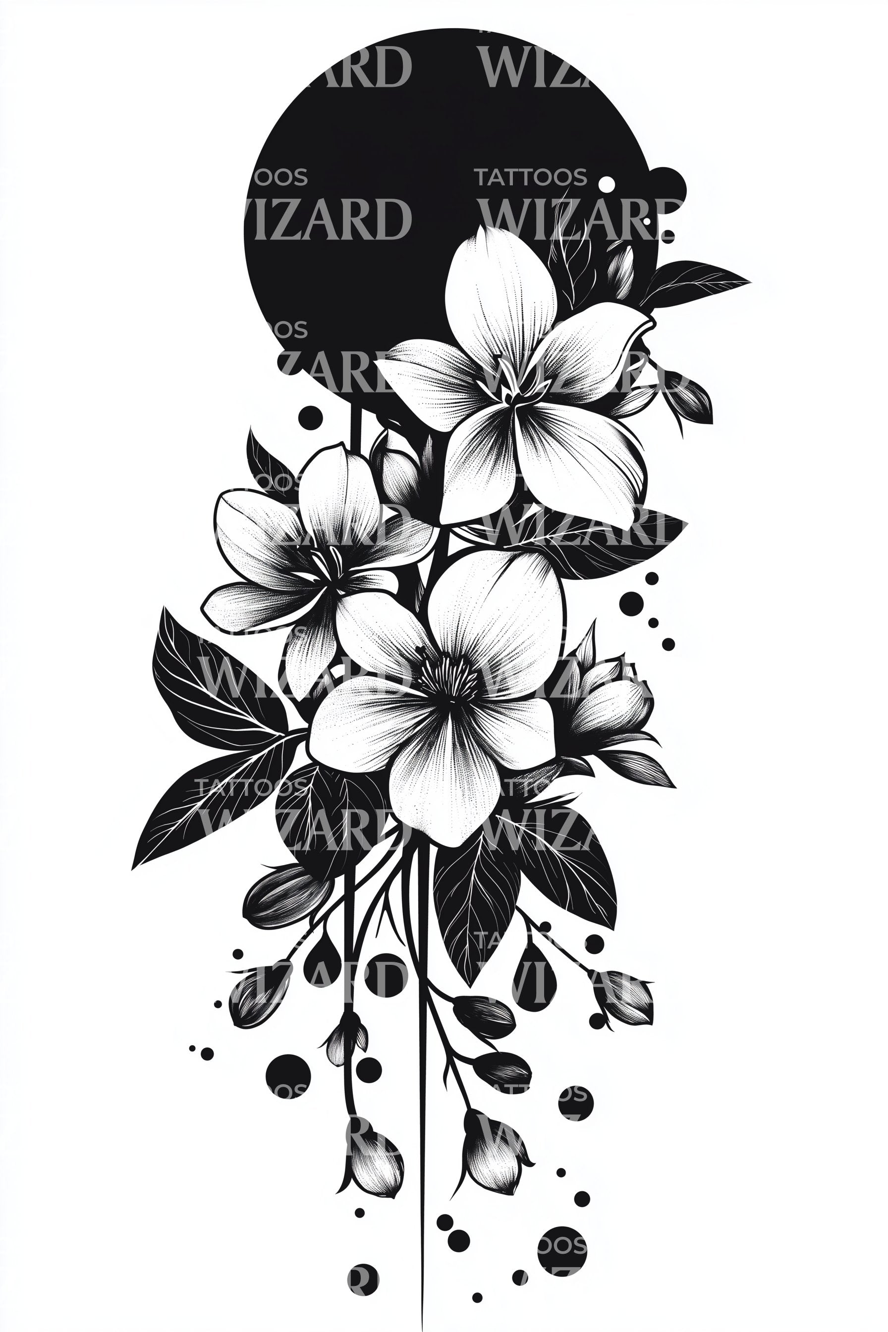 Avslöja din mystik med denna svart&grå tatuering. Den illustrerar en vacker kaskad av jasminblommor mot en mörk och mystisk förmörkelse, och utnyttjar en fantastisk kontrast. Bli ett med naturens skönhet, uttryck det modigt, och låt denna design fördjupa din duk med elegans.