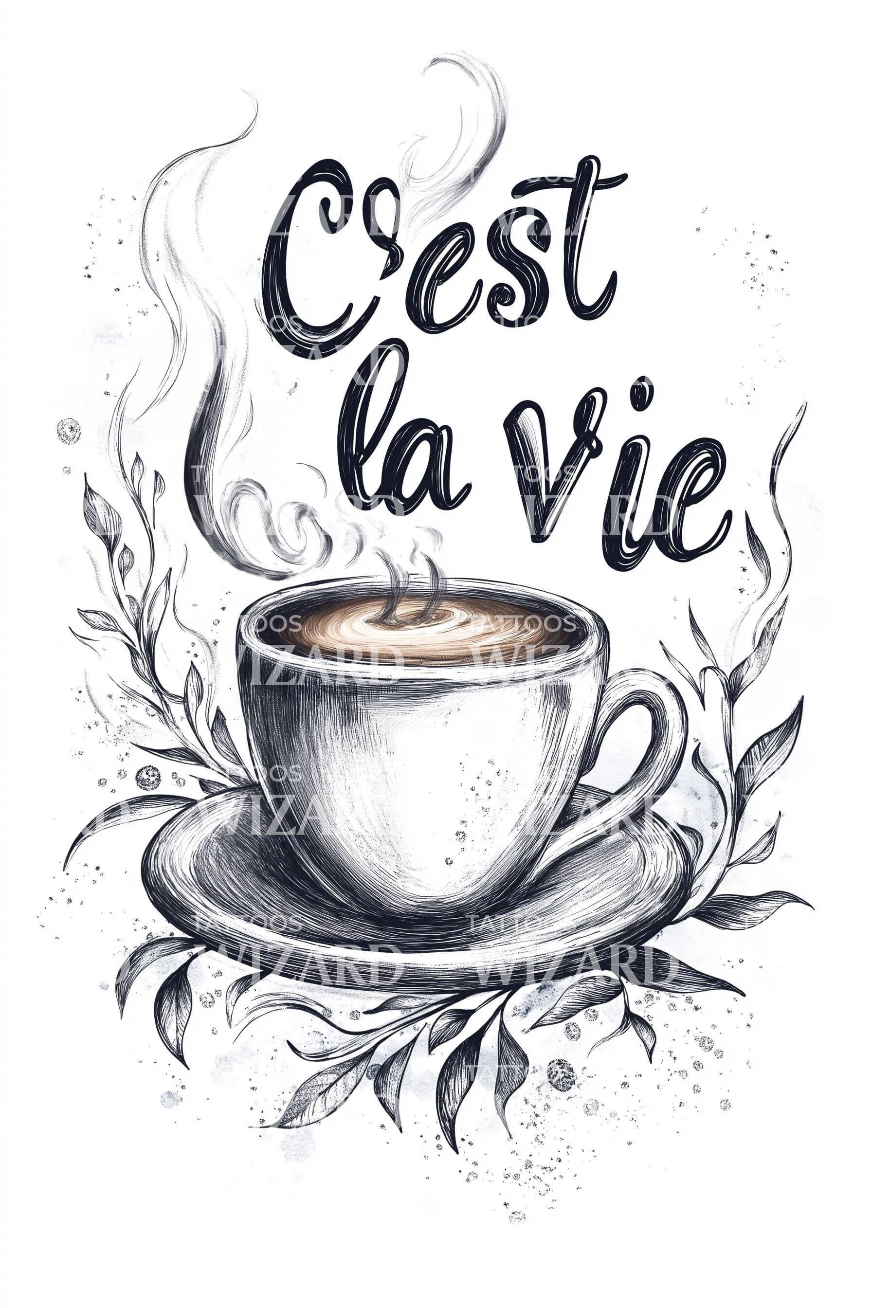 Fineline steam curls from a delicate espresso cup, framed by slender leaves and ink-kissed splatter, beneath the handwritten quote C’est la Vie. Coffee’s swirl marks resilience, warmth, and ritual comfort; foliage whispers growth. Worn on skin, this design feels like morning courage, acceptance, and everyday poetry.