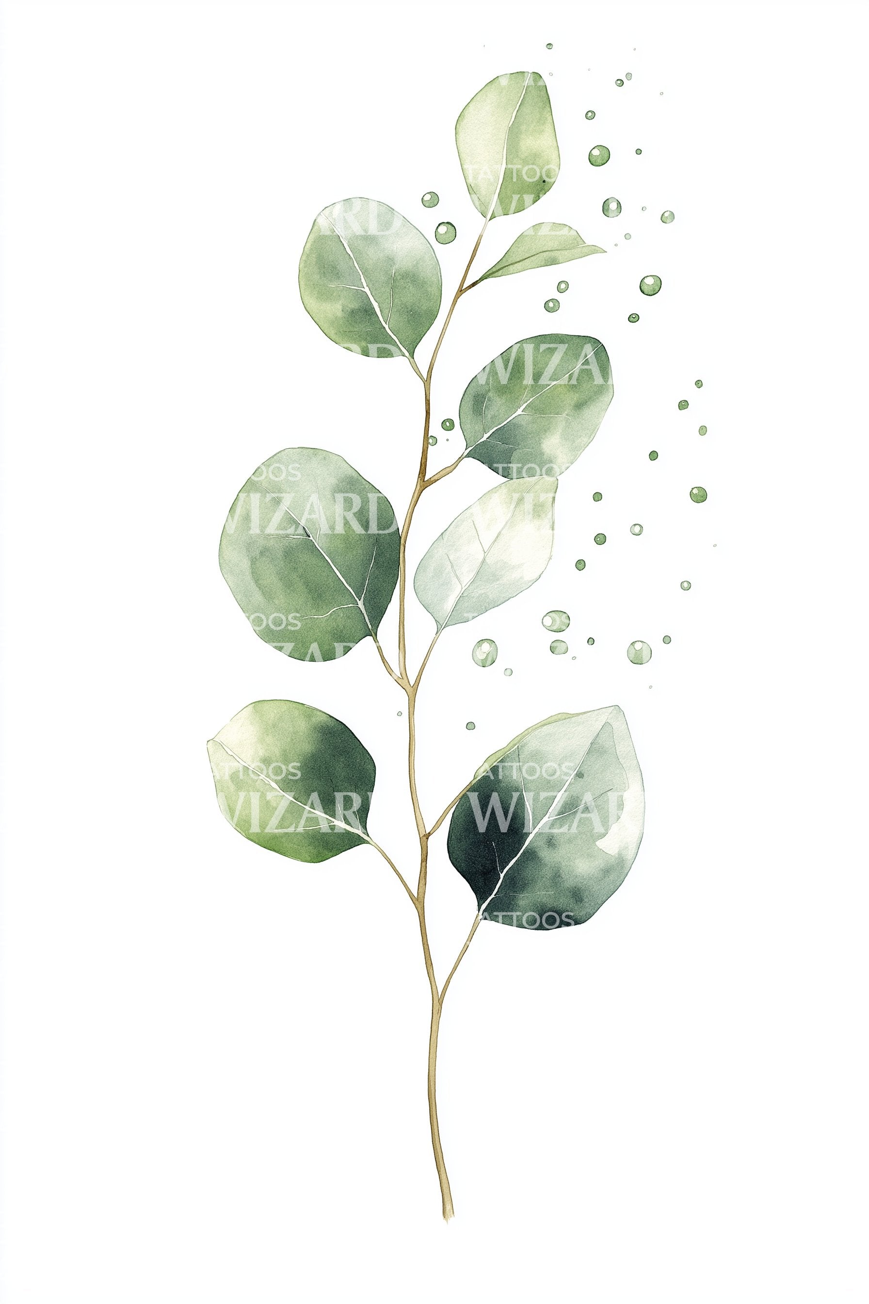Watercolor eucalyptus drifts upward in soft green washes, leaves veined with light, and a tender spray of ink. Symbolizing renewal, clarity, and cleansing breath, each rounded leaf whispers resilience. Worn on skin, this botanical keeps calm close, inviting quiet courage, grounded grace, and a fresh beginning.