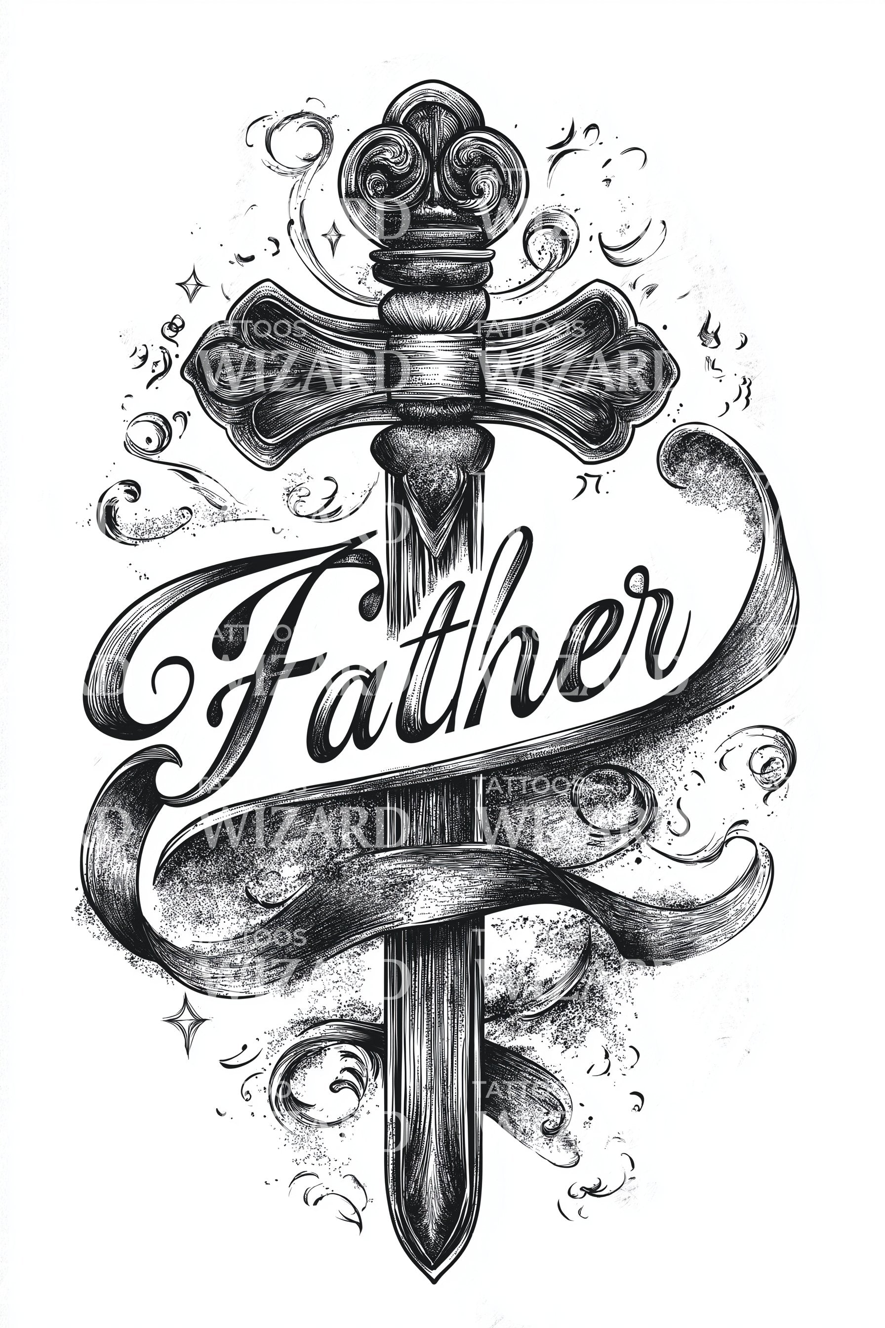 Heritage-steeped neotraditional dagger rises with ornamental guard, stippled shading and swirling flourishes. A flowing banner wraps the blade, cradling Father in bold script. The dagger embodies protection and strength; the banner, lineage and loyalty. Wearing it feels like carrying family honor, steadfast guidance, and timeless love.