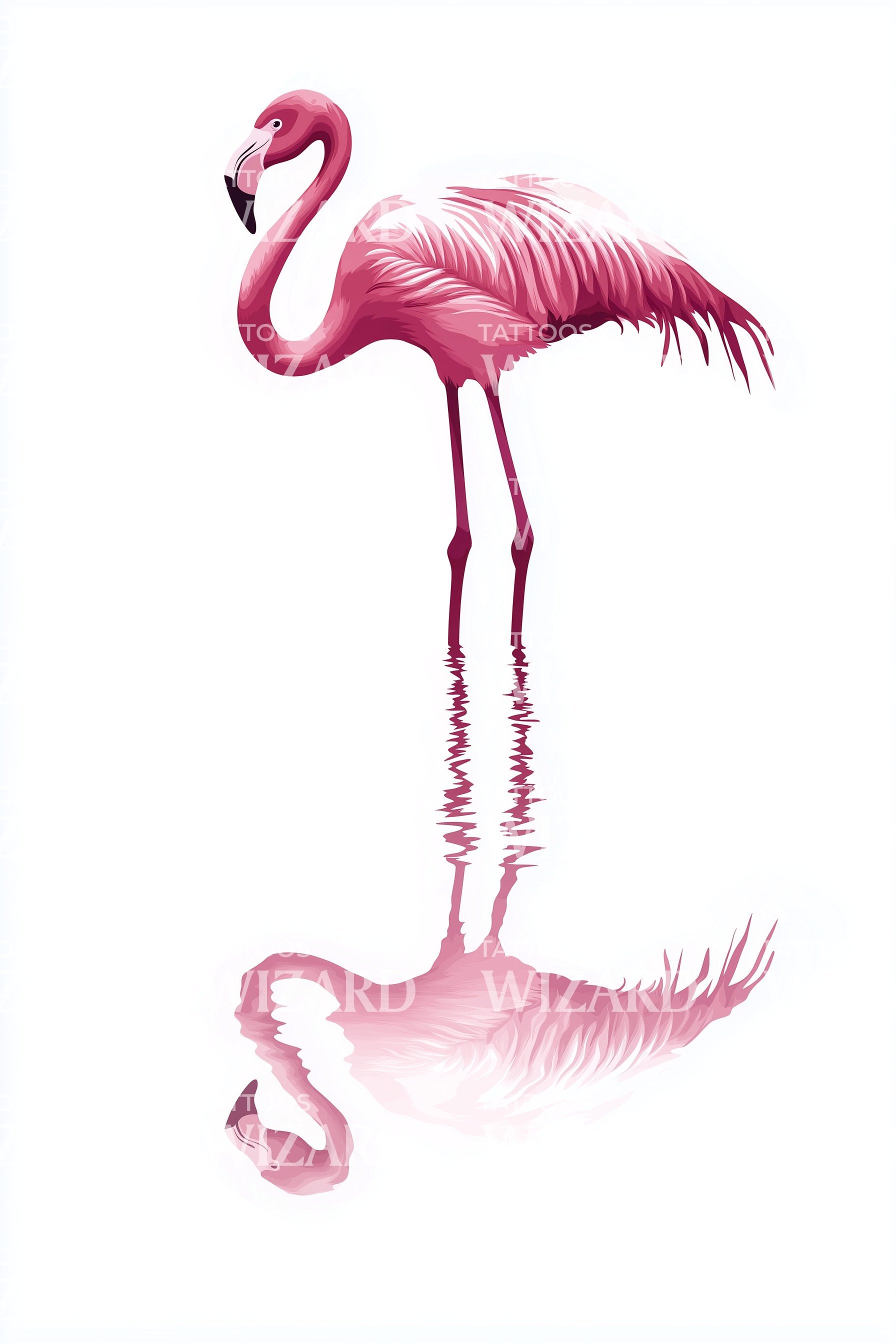 Akvarellrodnader i rosa formar en elegant flamingo, speglad i krusande vatten. Denna fågel symboliserar nåd, balans och självreflektion, och hedrar lugn styrka och motståndskraftig skönhet. Att bära den känns fridfullt, självsäkert, tyst strålande. Ideala placeringar: underarm eller vad för vertikal flöde, revben för intim elegans, ryggrad för förlängd reflektion.