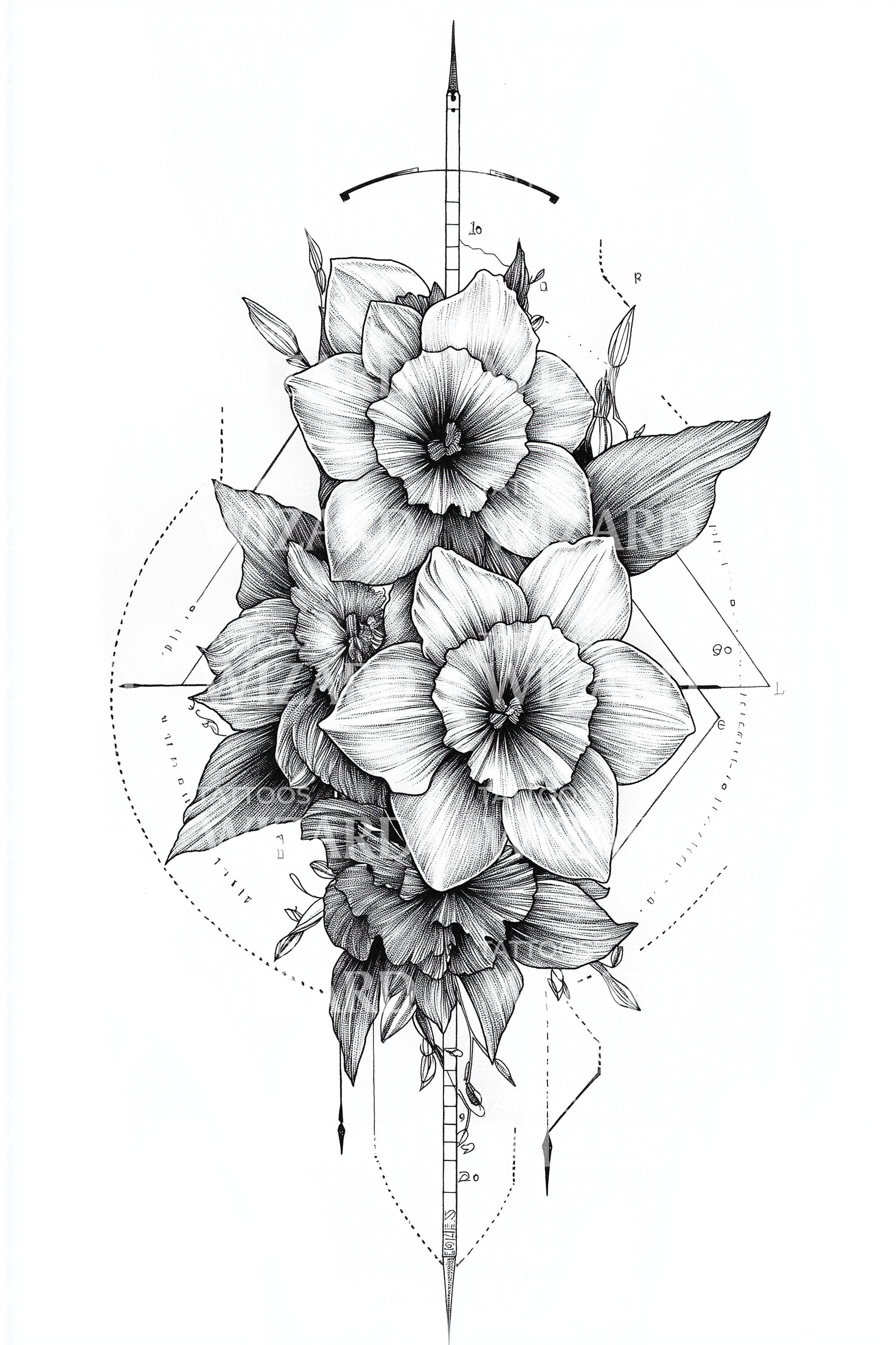 Utforska mötet mellan konst och anatomi med denna geometriska tatuering. Noggrant utformad med en abstrakt blomklase, där de intrikata kronbladen blommar i slående prickarbetets detaljrikedom. En sammansmältning av form, mönster och textur, detta verk förvandlar huden till en fängslande duk.