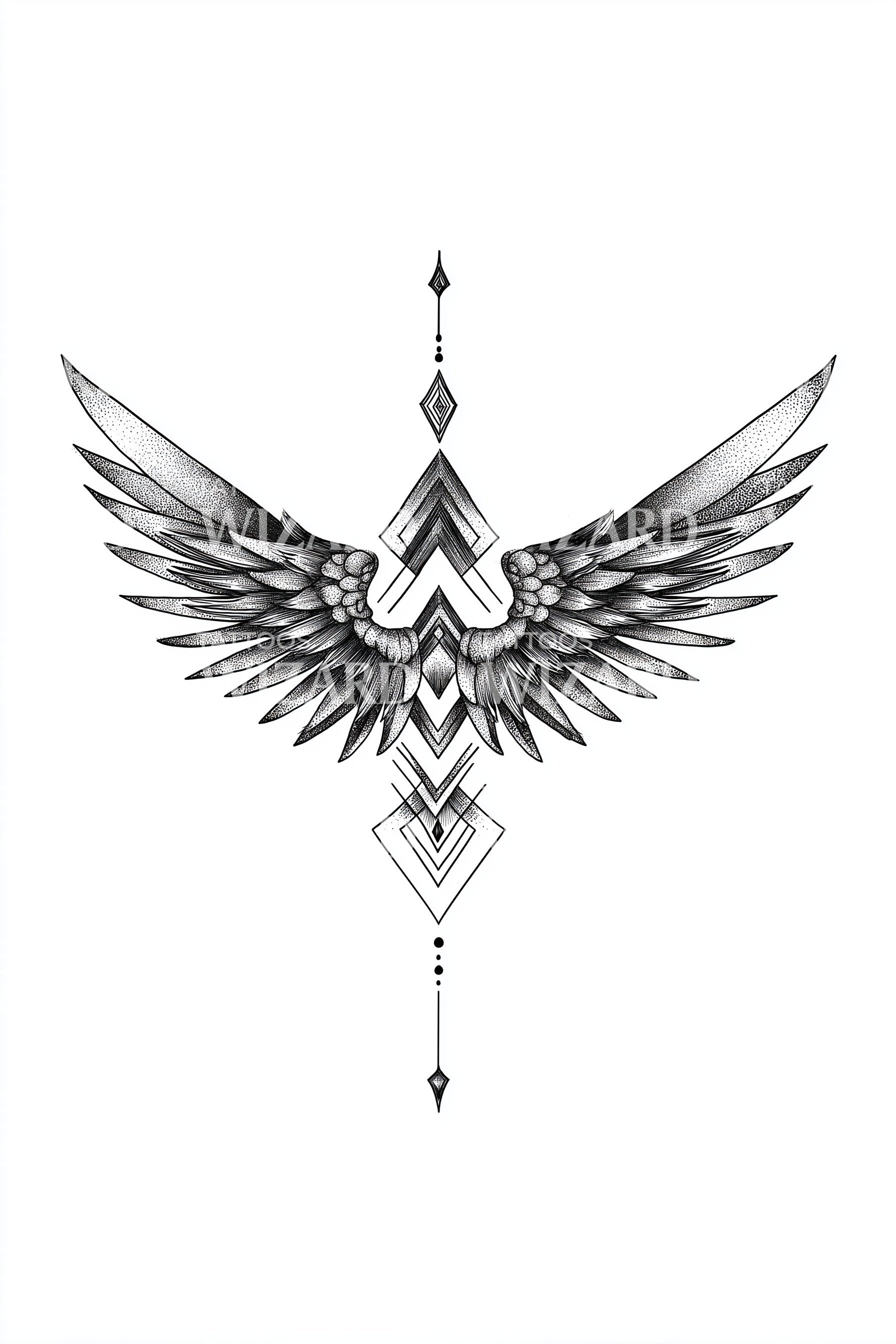 Ascending geometric lines frame feathered wings, rendered in delicate dotwork along a precise vertical axis. Diamond motifs stack like milestones, guiding flight into focus. Symbolizing freedom guided by intention, this modern sigil balances wild heart and direction, letting the wearer feel uplifted, centered, and courageously aligned, every day.