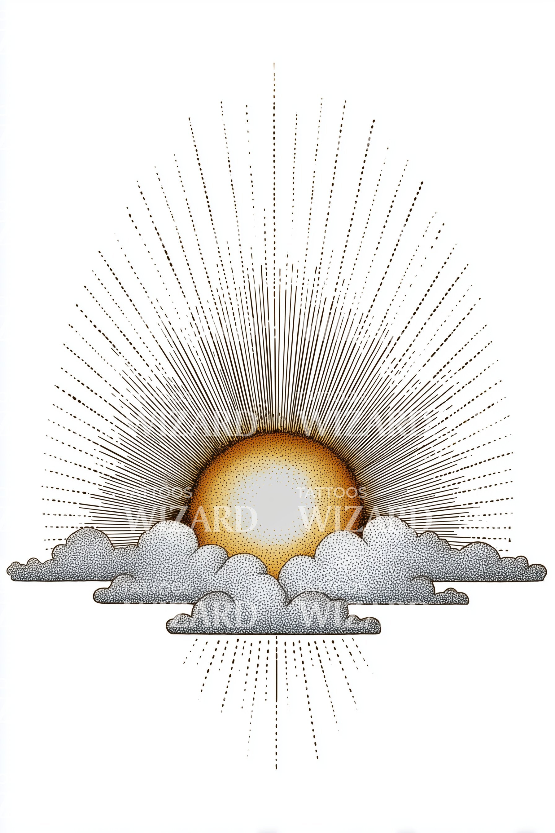 Golden sunrise lifts from a soft horizon, fine lines and dotted rays fanning through quiet clouds. A minimal composition honoring renewal and courage, it symbolizes each day’s beginning. Wearing it feels like carrying a warm glow within, steady light for fresh starts and calm resilience, hope, and clarity.
