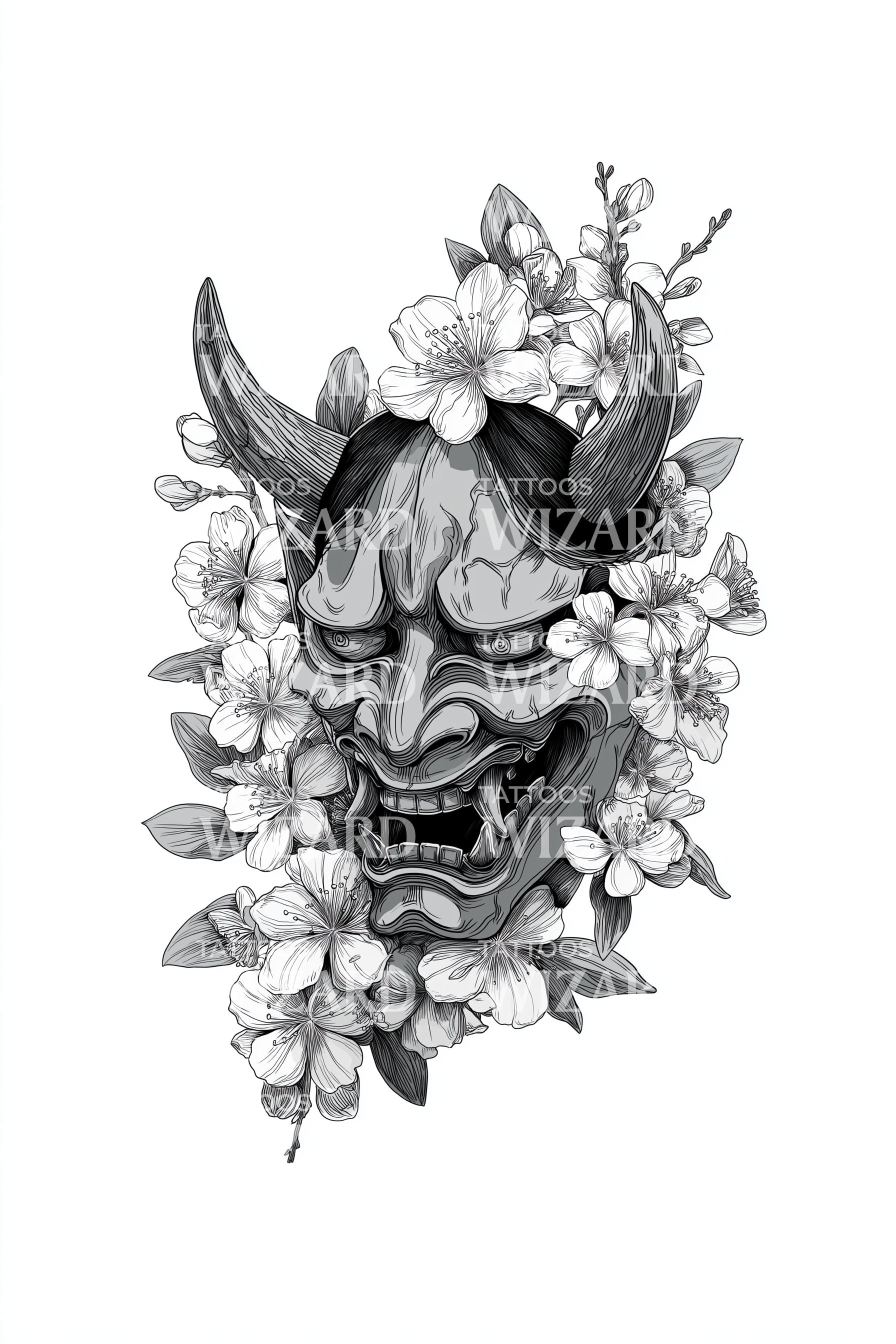 Denna utsökta blackwork-tatuering visar en hotfull Hannya-mask som fascinerande symboliserar en ande eller demon. Tillsammans med ömtåliga blommor som skapar en skarp kontrast, representerar den på ett underbart sätt mystiken och lockelsen i japansk mytologi. Denna tatuering uppvisar intrikata detaljer och enastående finess.