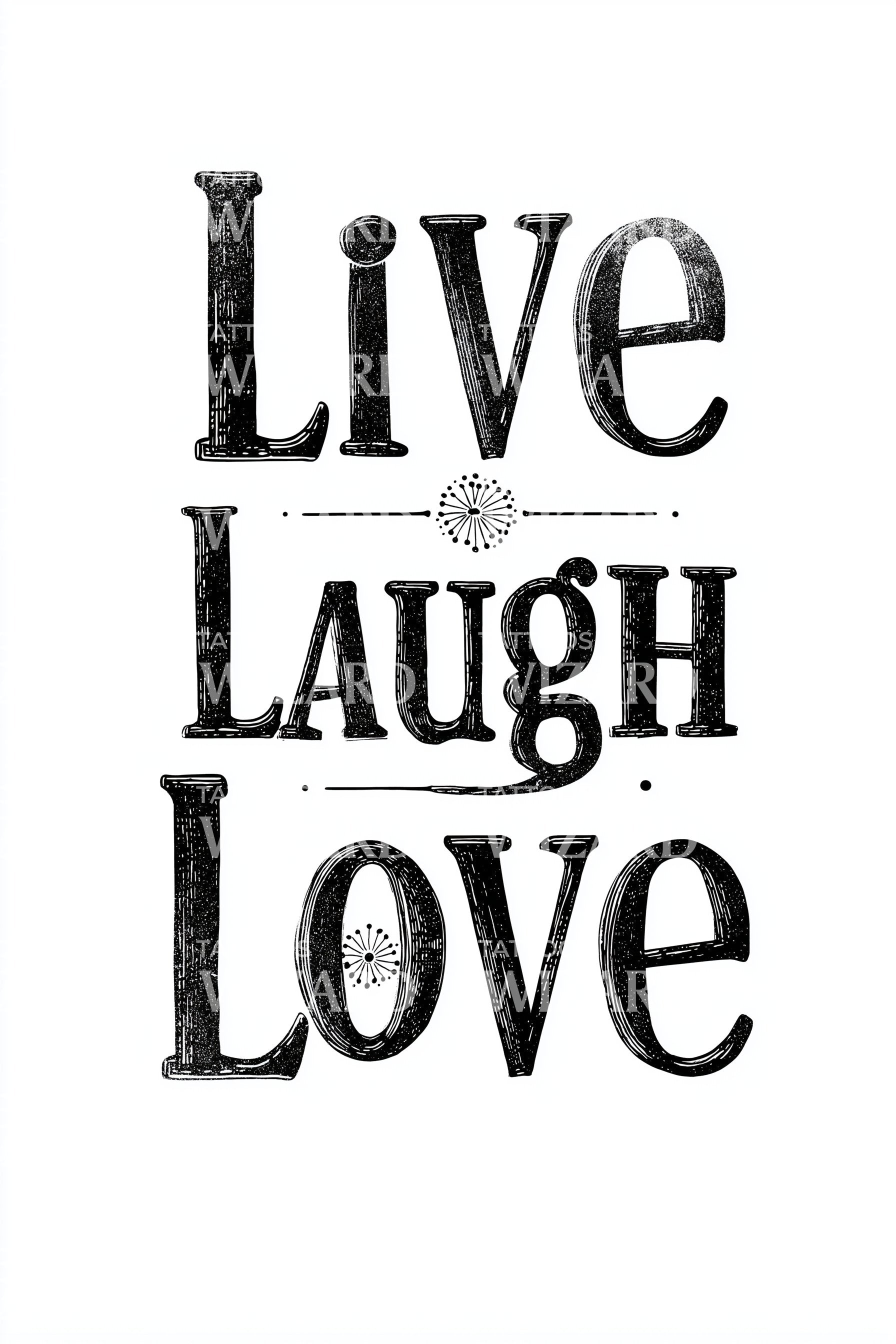 Bold vintage serif letters stack in three lines: Live, Laugh, Love, textured like hand-pressed type with quiet starbursts. A quote that distills breath, joy, and devotion, reminding daily presence. Feels steady, uplifting, honest. Ideal on forearm or spine for vertical flow; ribcage or calf for elongated clarity and readability.