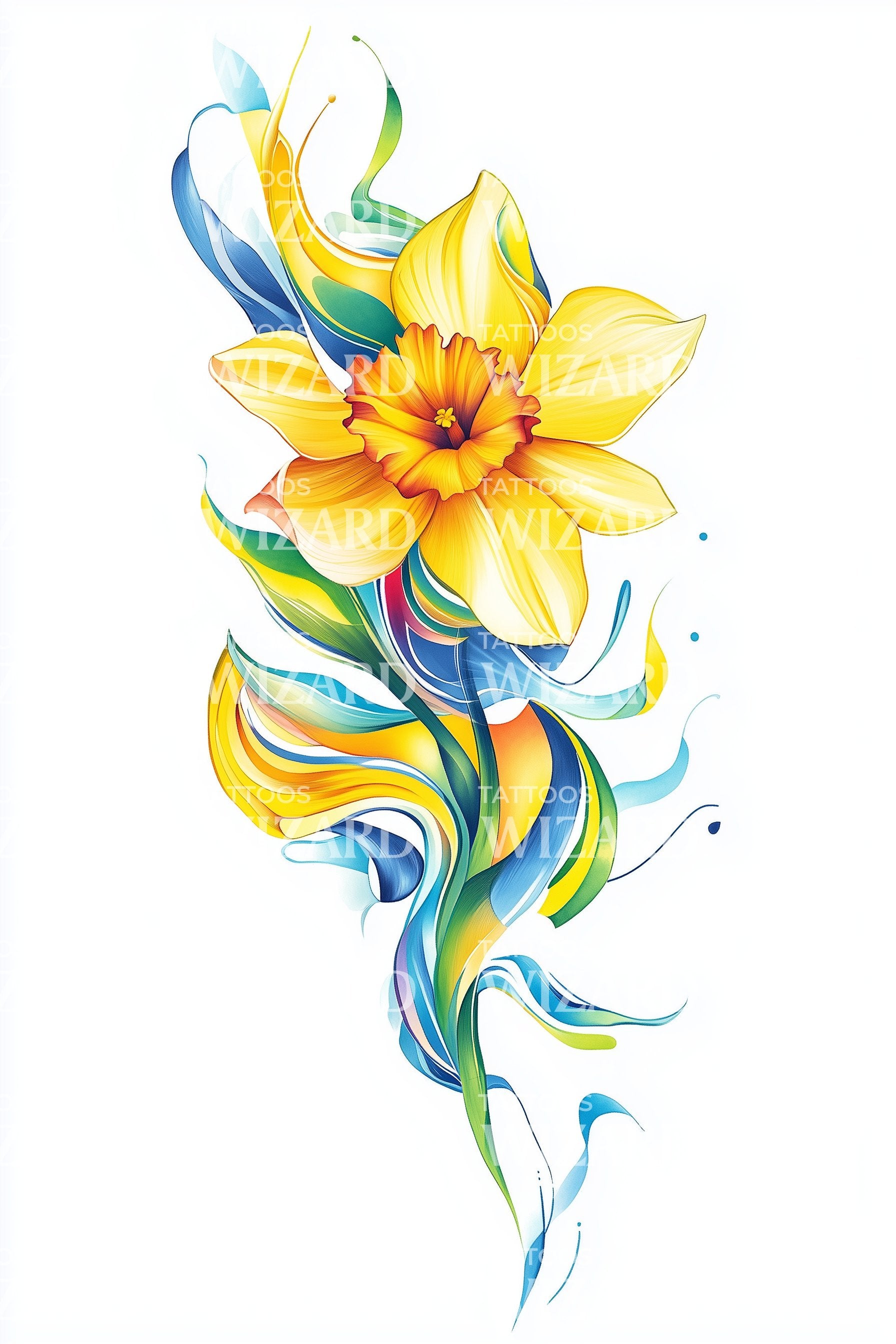 Fördjupa dig i den fängslande skönheten hos denna akvarelltatuering, som förkroppsligar liljans grace och flöde. Konstnärligt framställd i livfulla gula nyanser, symboliserar den subtil elegans. Lägg till en touch av botanisk charm till din stil med denna symbol för förfinad skönhet.