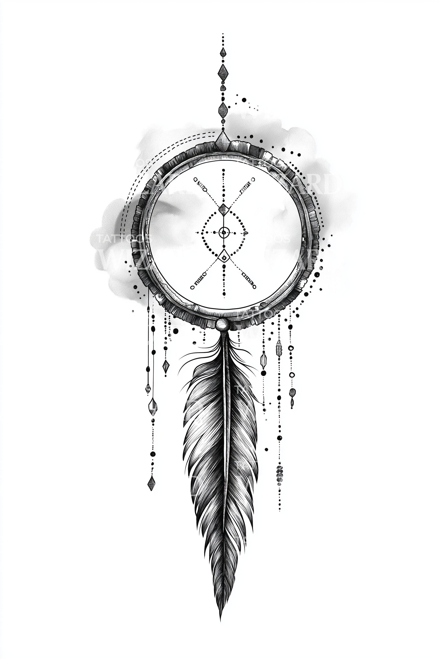 Fineline dreamcatcher floats in black ink, a haloed circle with dotted geometry and delicate beaded strands cascading to a single soft feather. Symbol of protection and clarity, it filters noise, keeps wisdom near, and honors wanderers. Worn, it feels light, protective, quietly boho, inviting lucid, guided journeys.