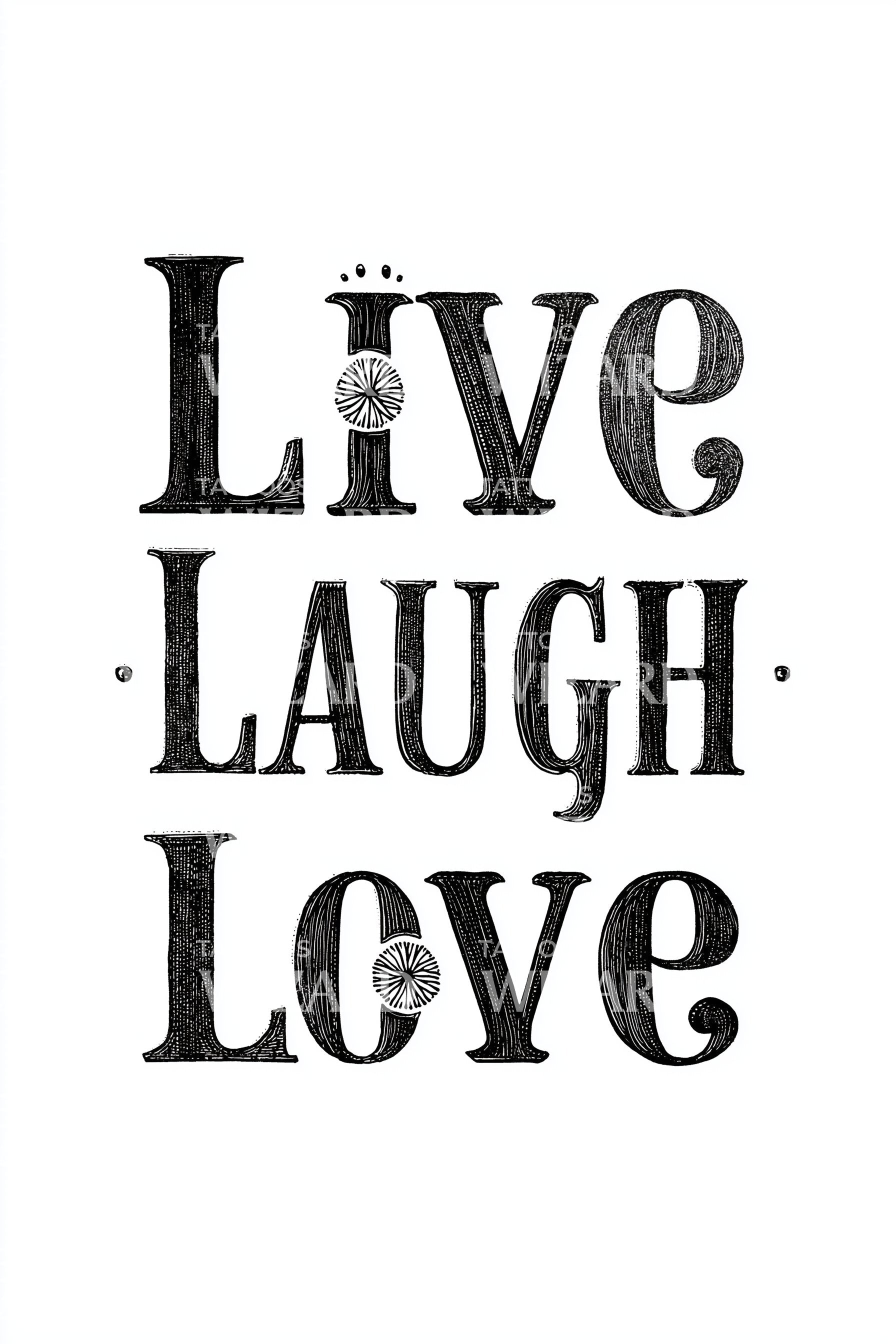 Bold blackwork typography stacks Live Laugh Love in vintage letterpress texture and sunburst accents. The quote becomes a daily compass, dots marking mindful pauses, bursts igniting joy. Wearer feels grounded, buoyant, present. Ideal placements: forearm or calf for vertical flow, spine for alignment, sternum for centered devotion, ribcage for elegant sweep.