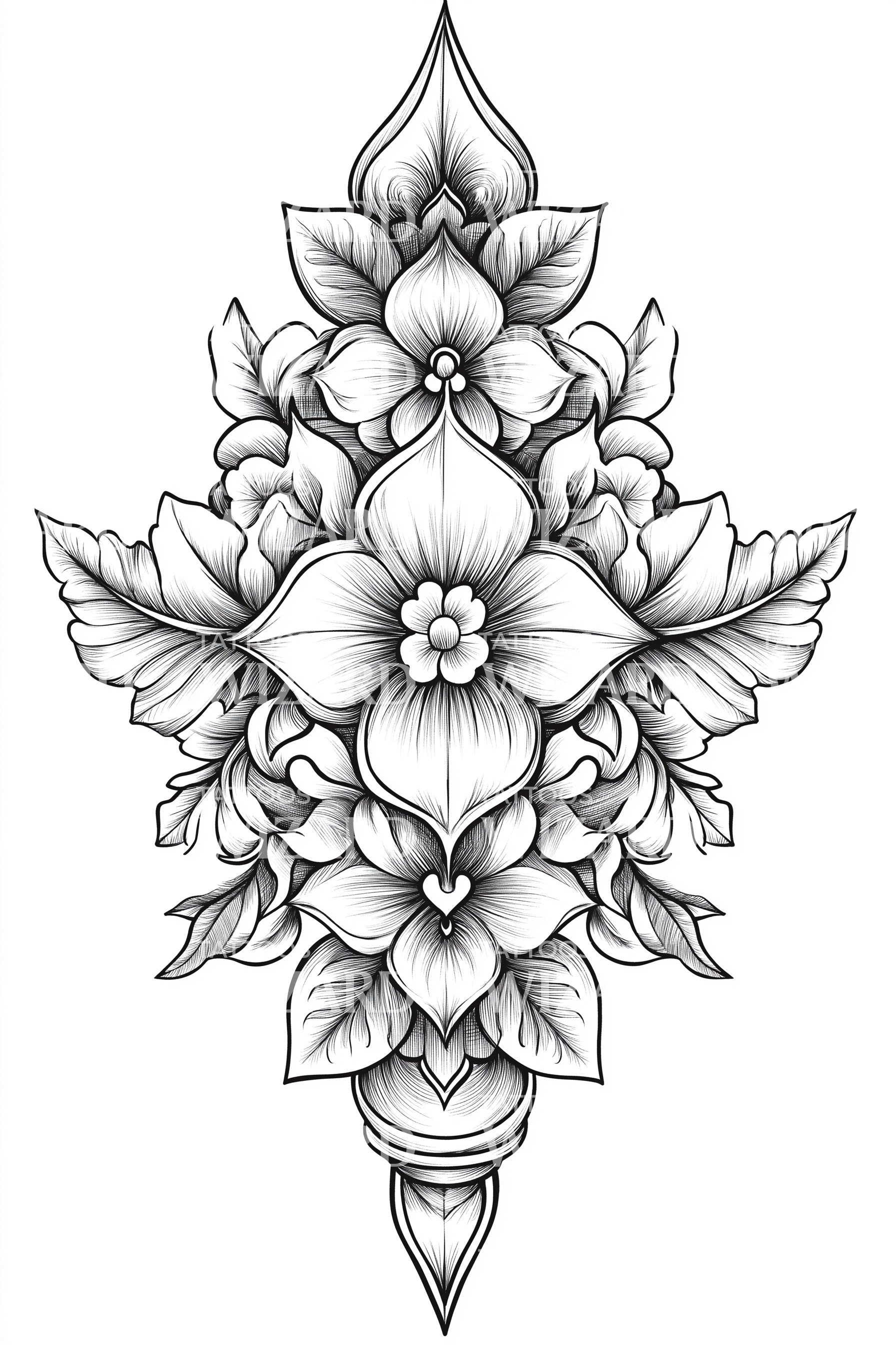 Ge din hud elegans med denna ornamentala tatuering. Den delikata filigranen slingrar sig runt en blommande lotusblomma och skapar en utsmyckad illusion av ett hänge. Den låter dig bära med dig sofistikering och symbolisk renhet för alltid. Släpp loss din inre skönhet med denna eleganta blomsterdesign.