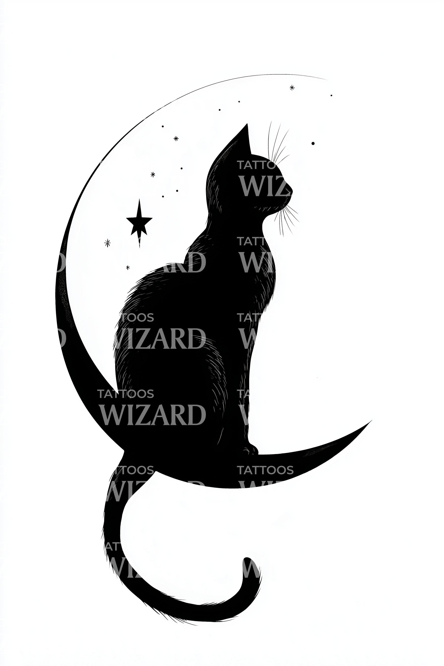 Midnight silhouette of a cat perched on a slim crescent, ringed by quiet stars. Clean lines, soft texture, negative space breathing night air. Symbol of intuition, curiosity, and cycles, the moon holds watchful independence. Worn on skin, it feels calm, protective, subtly rebellious, a private constellation for wanderers.
