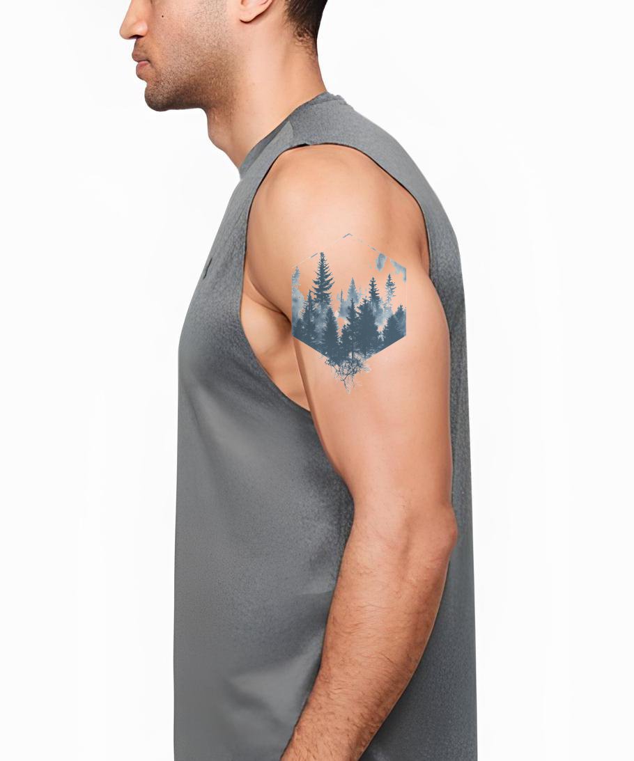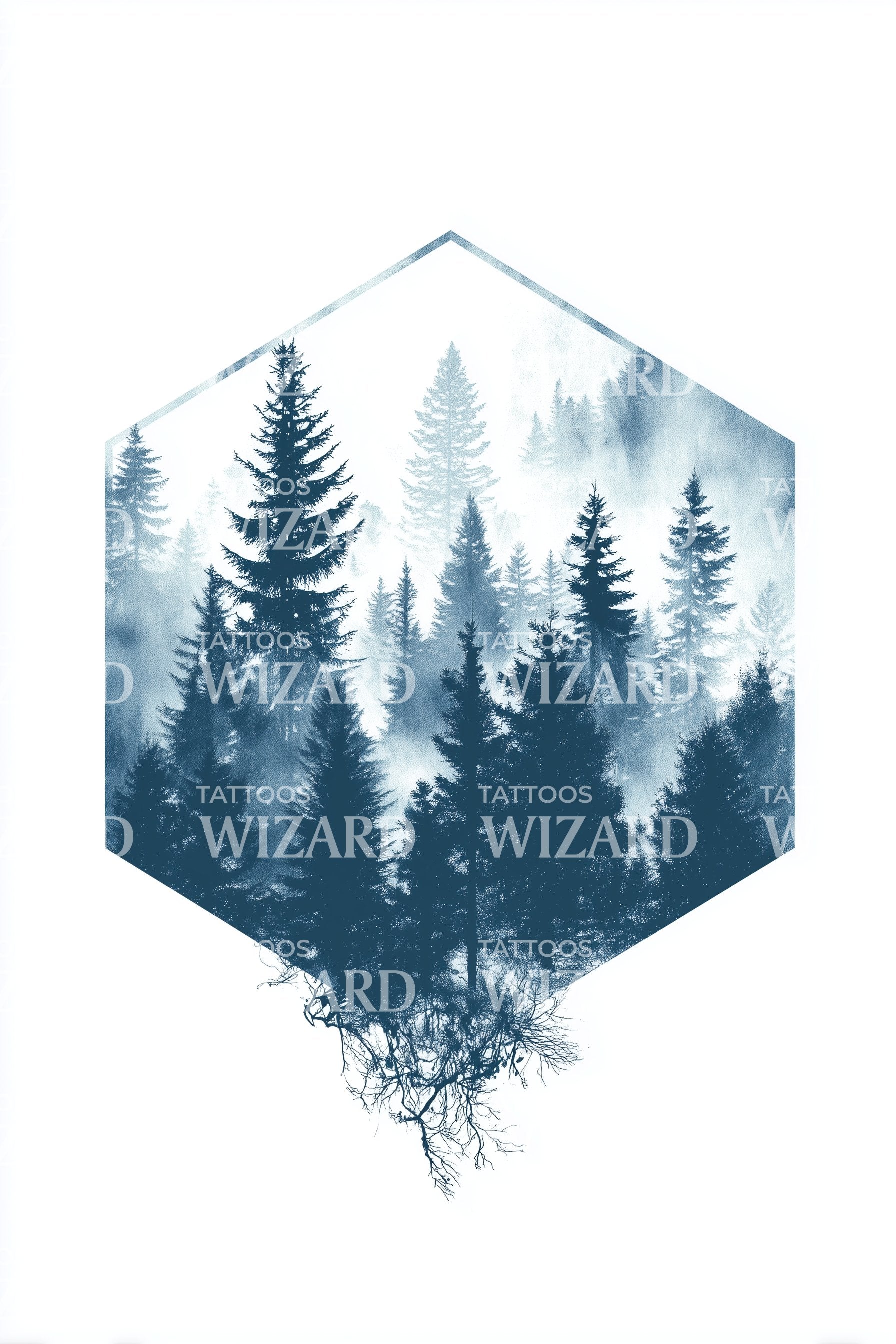 Fördjupa dig i naturens skönhet med denna akvarelltatuering. Den avbildar en mystisk skogsscen inom en elegant hexagon och kombinerar konstnärligt inslag av blått och dimma, vilket framkallar en lugn aura. De detaljerade träden förstärker den fängslande dragningskraften och gör denna design till ett perfekt sätt att uttrycka din kärlek till naturen.