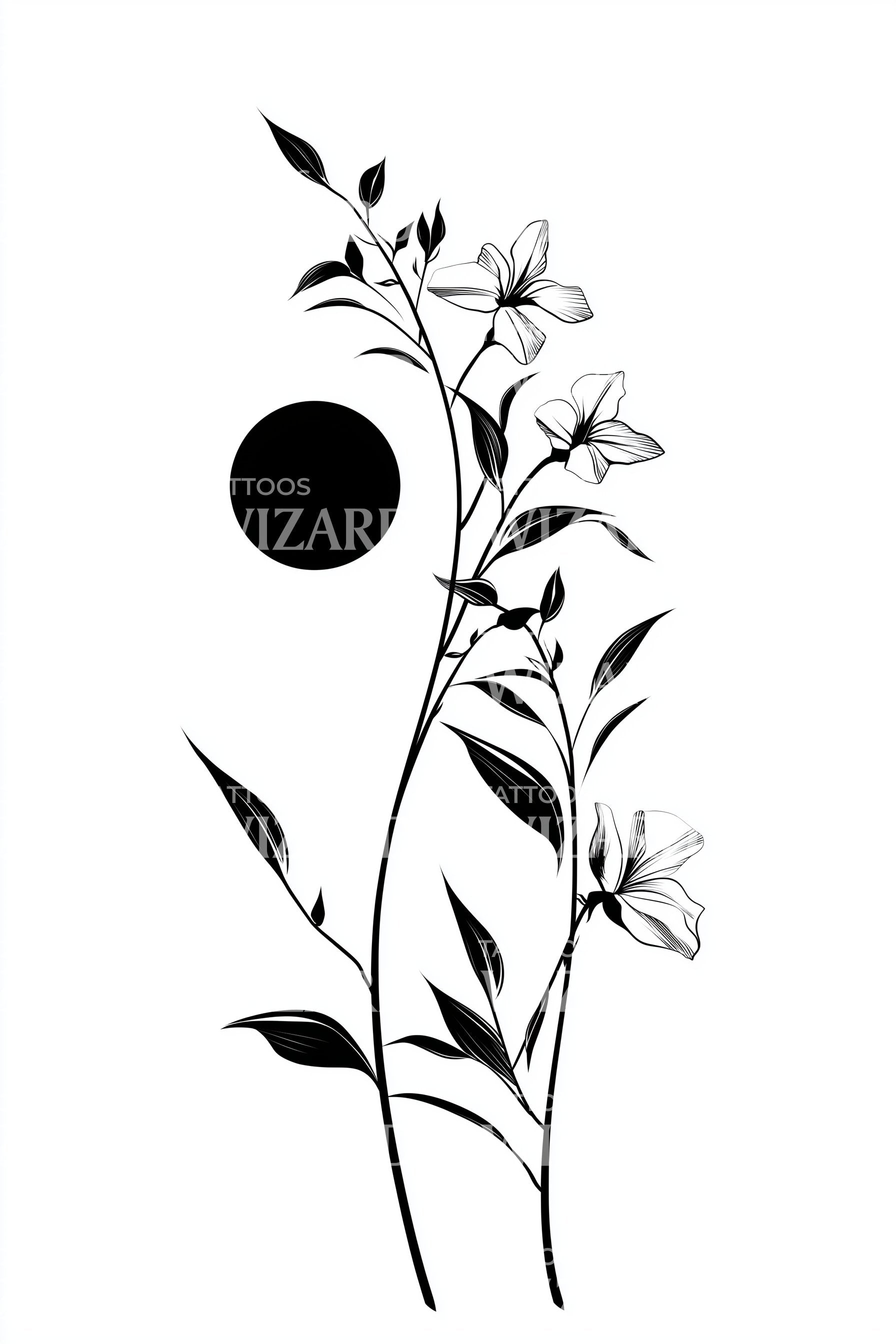 Denna blackwork-tatuering skildrar slående en silhuett av en jasminstjälk under en månbelyst natt, vilket skapar en förtrollande kontrast. Den mörka natthimlens duk förstärker blommans invecklade detaljer, vilket gör denna design till en fantastisk hyllning till naturens skönhet och mysterium.