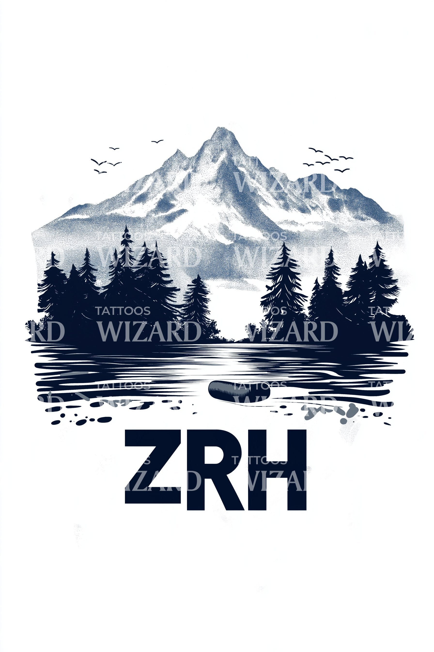 Ink-washed Alps rise above mirrored water, framed by shadowed pines and drifting birds, with bold ZRH anchoring the horizon. Mountain strength, lake clarity, and evergreen resilience honor Zurich’s soul and Swiss landscapes. Wear it for grounded calm, adventurous spirit, and a personal compass pointing home through every journey.