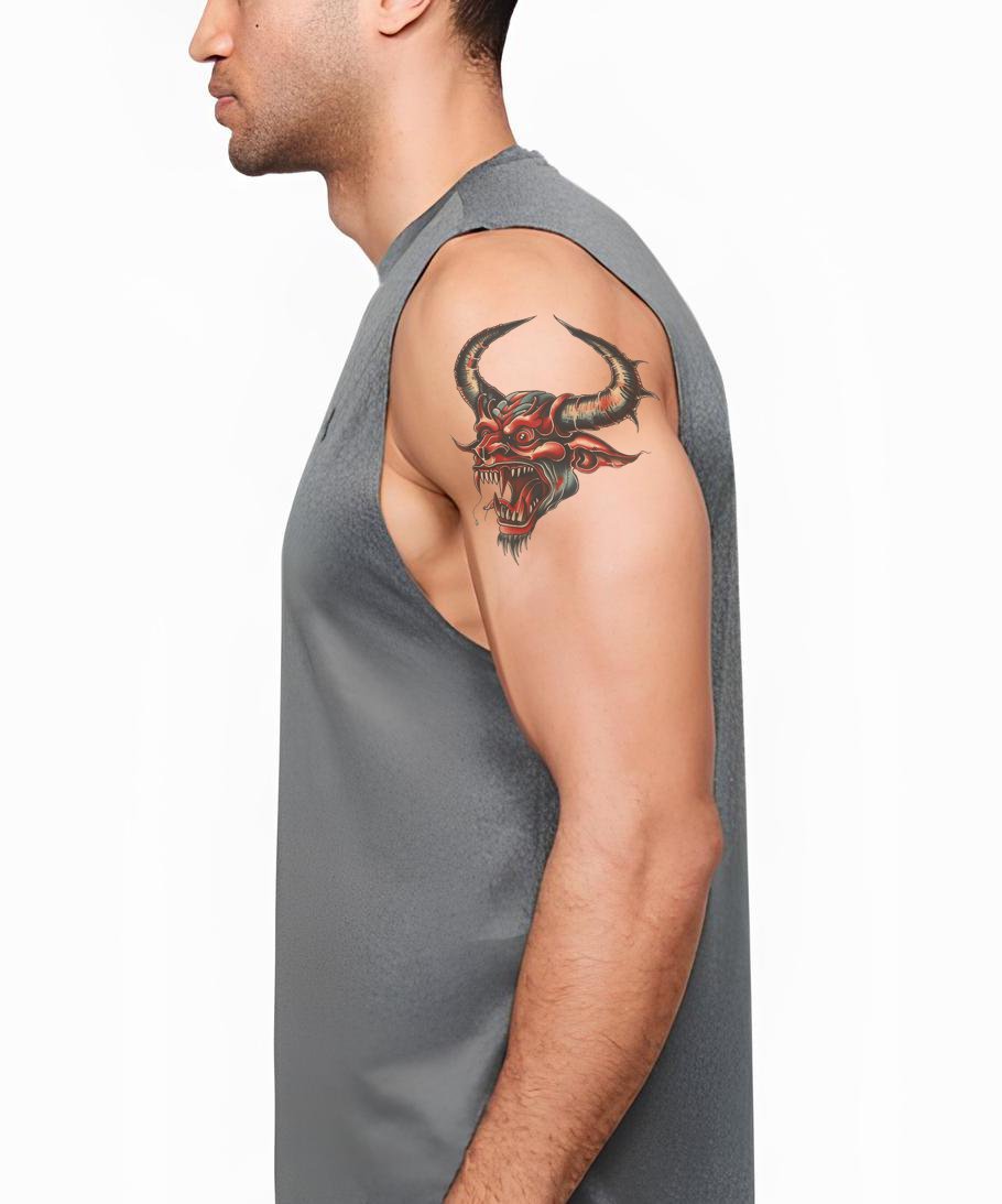 Släpp loss din mörkare sida med denna Oldschool Devil-tatuering. Den balanserar mellan ondskefull och charmig, och skildrar skickligt Satan som en monstruös varelse med framträdande horn. Den anspelar på vintage tatueringsikonografi och tillför en klassisk kant till din rebelliska estetik.
